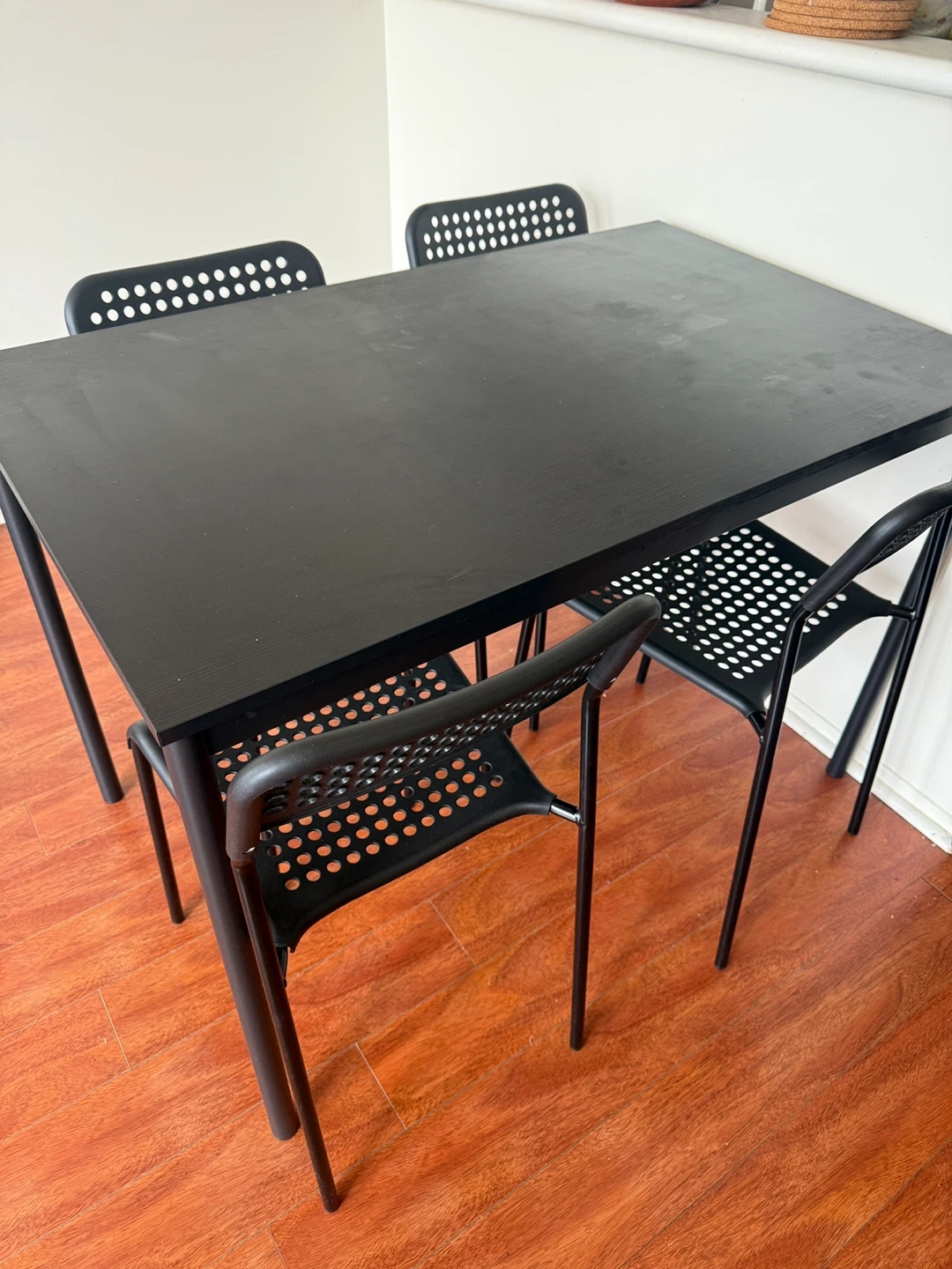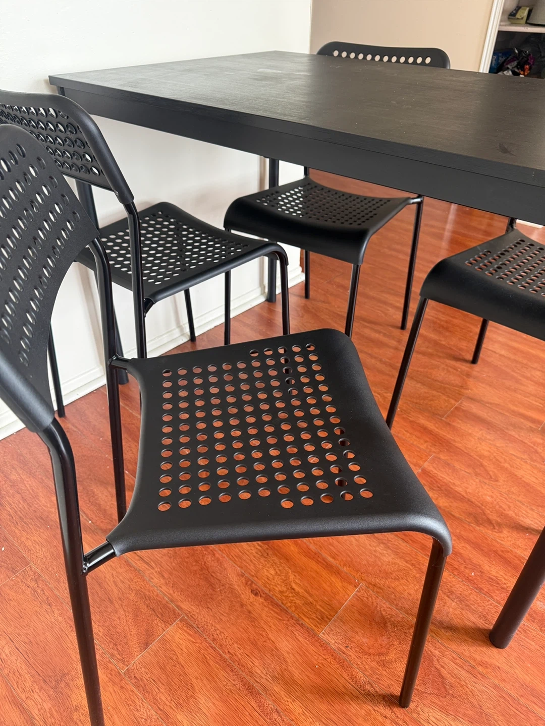 Black IKEA dining table with four matching perforated chairs. It's a compact set, great for smaller spaces. Durable metal construction for longevity.