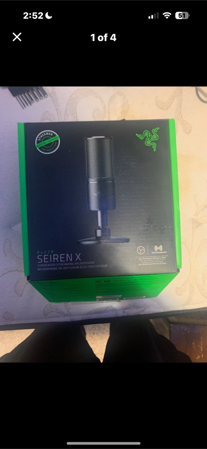 This is a Razer Seiren X condenser streaming microphone. It's streamer certified and comes in its original box. This mic is great for clear audio capture.