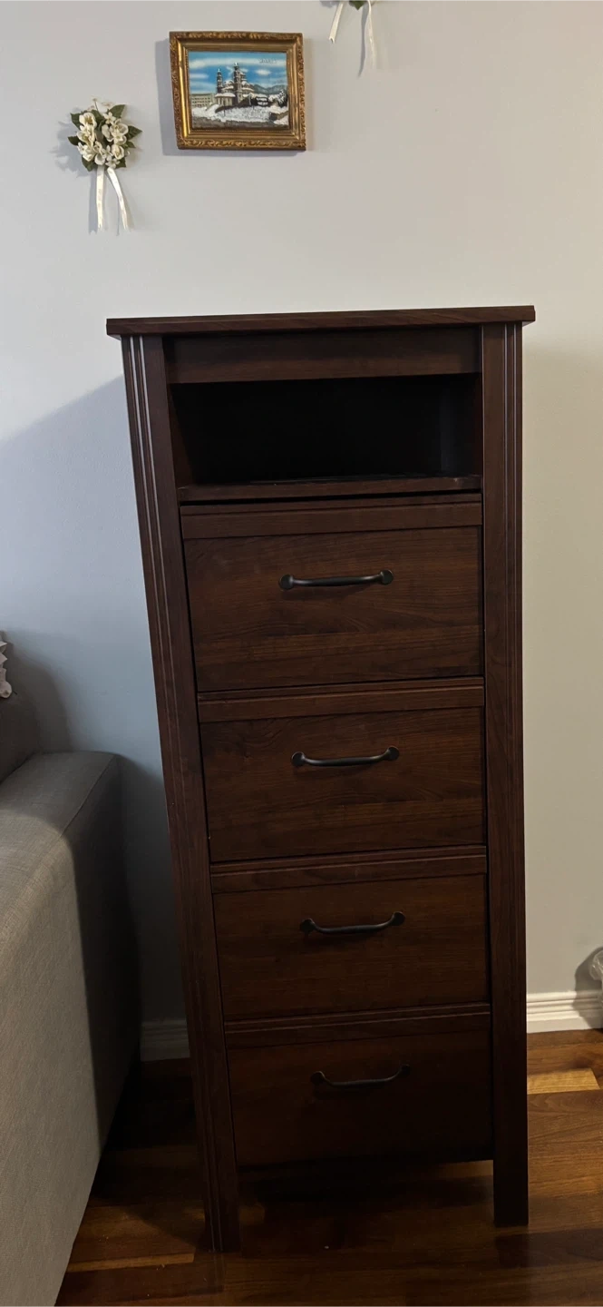 This tall, narrow chest features four drawers for storage and an open shelf at the top. It's made of dark wood with black handles. Great for organizing smaller spaces!