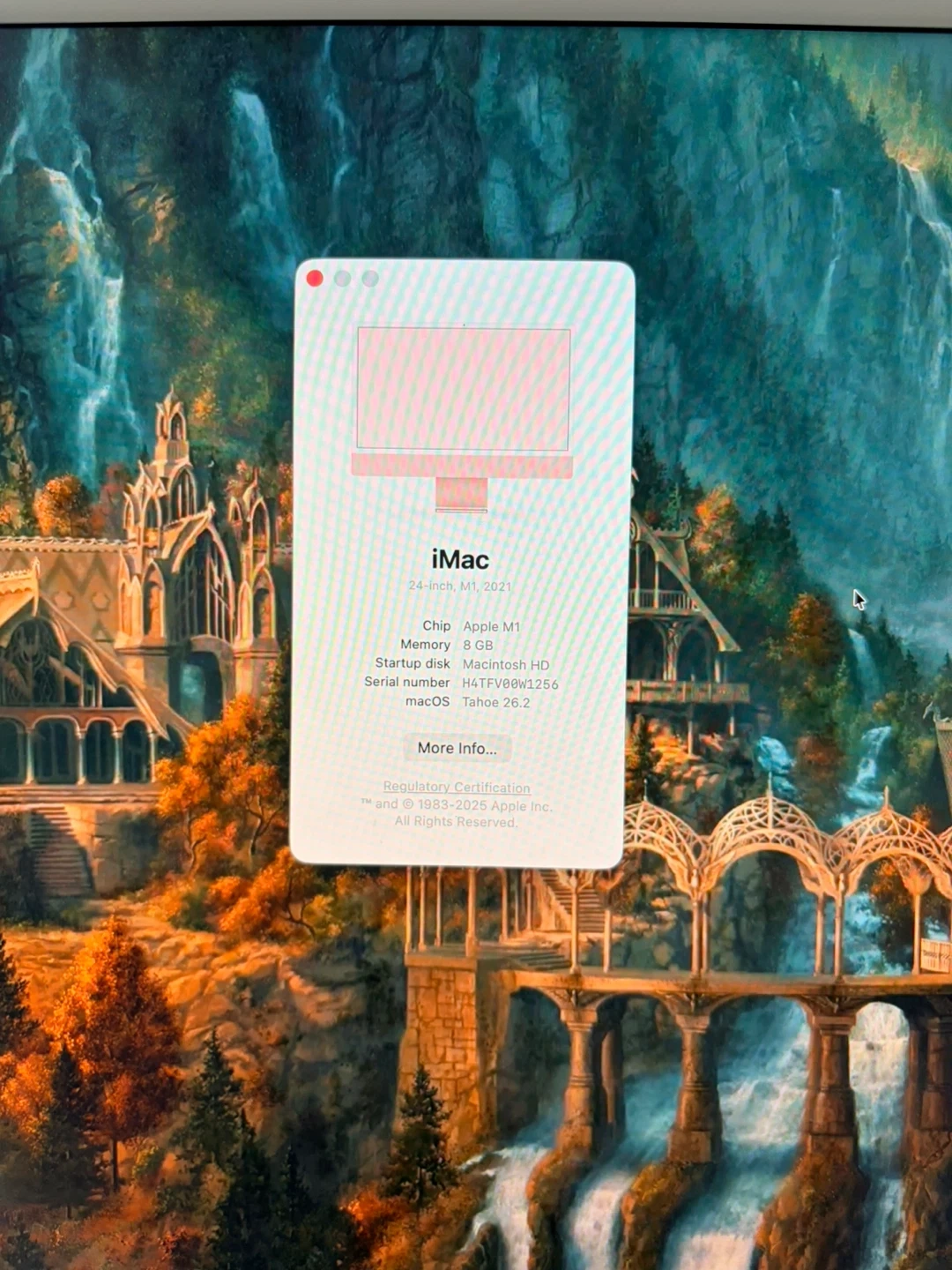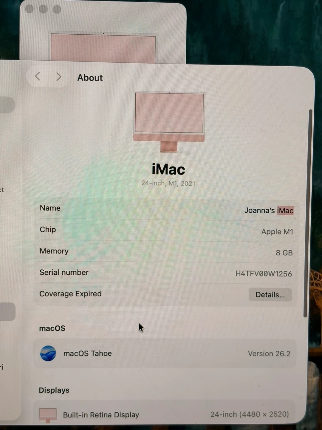 This is a 24-inch iMac from 2021, powered by an Apple M1 chip. It has 8 GB of memory and a 24-inch Retina display. The operating system is macOS Tahoe version 26.2. Storage is 245.11 GB total.