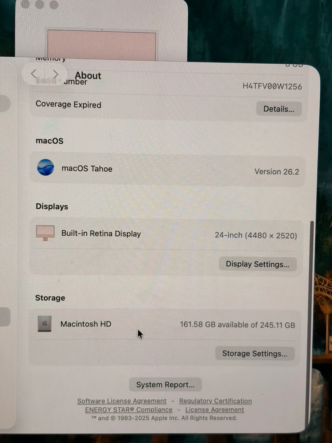 This is a 24-inch iMac from 2021, powered by an Apple M1 chip. It has 8 GB of memory and a 24-inch Retina display. The operating system is macOS Tahoe version 26.2. Storage is 245.11 GB total.