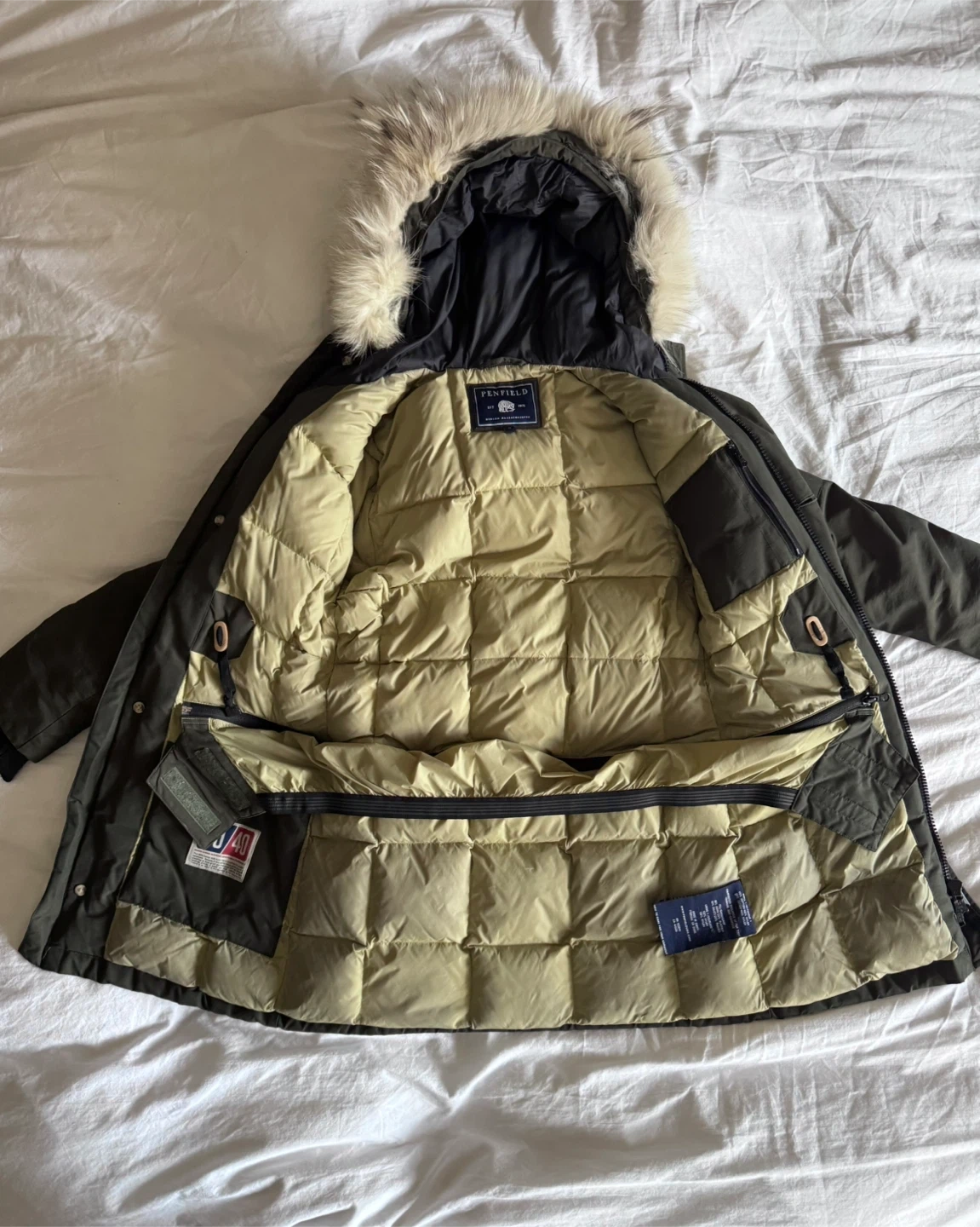 Lightly worn Penfield parka with detachable hood (snap buttons) real coyote fur trim in size S. Edge of the hood has a metal wire sewn in so that you can control the shape of the hood. There are strings with wooden Penfield beads on either side of the hood to tighten.