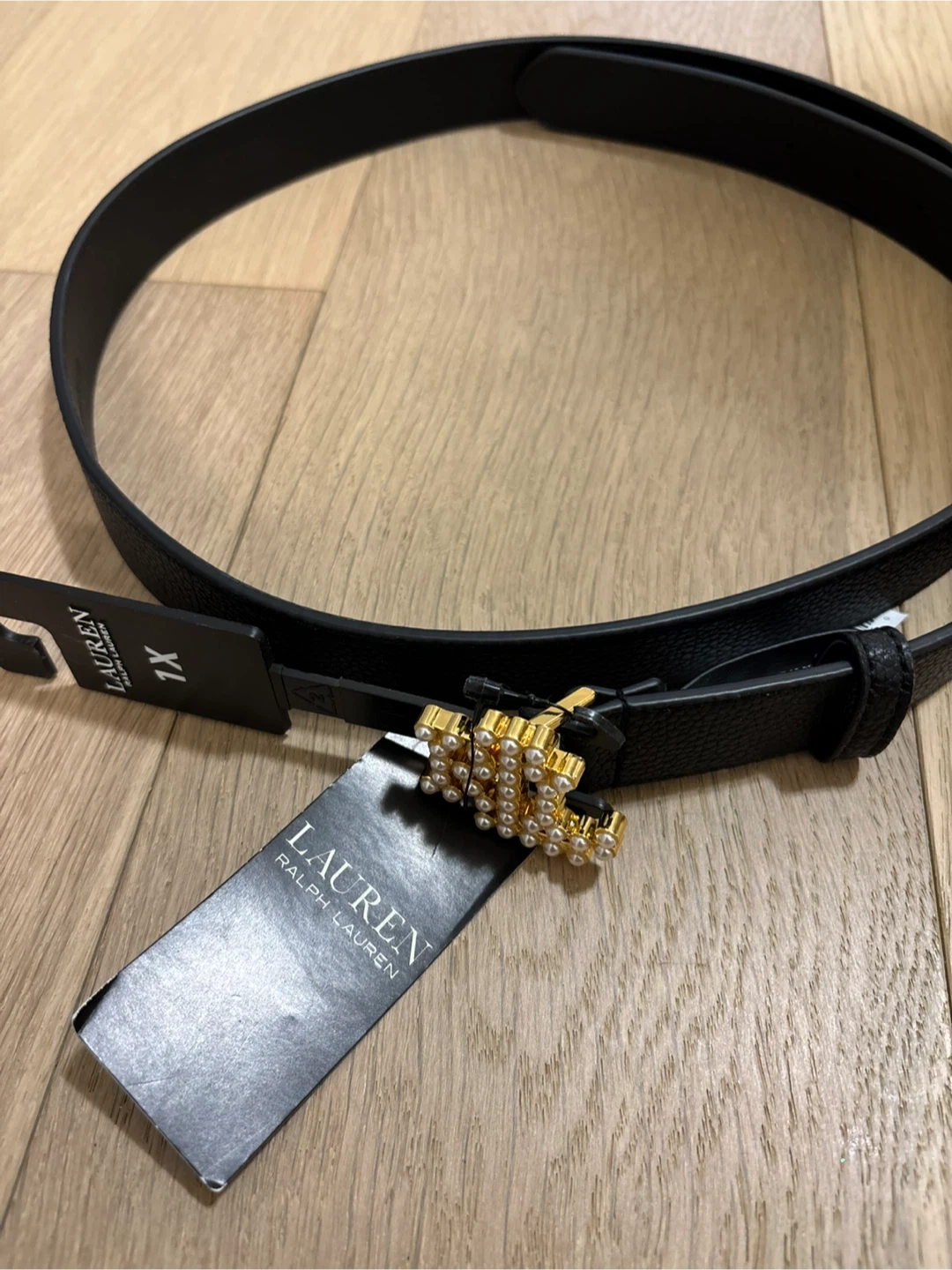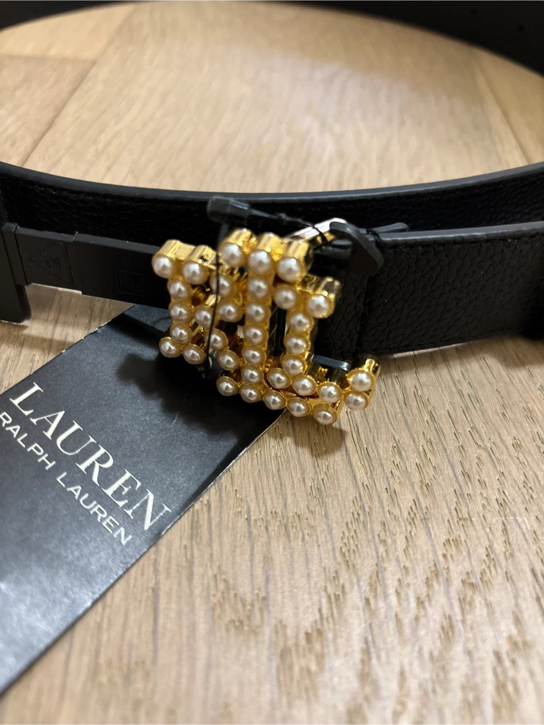 Selling a brand new Ralph Lauren belt in black, size XXL. The belt has a stylish gold-tone buckle adorned with faux pearls. It's perfect for adding a touch of elegance to any outfit!