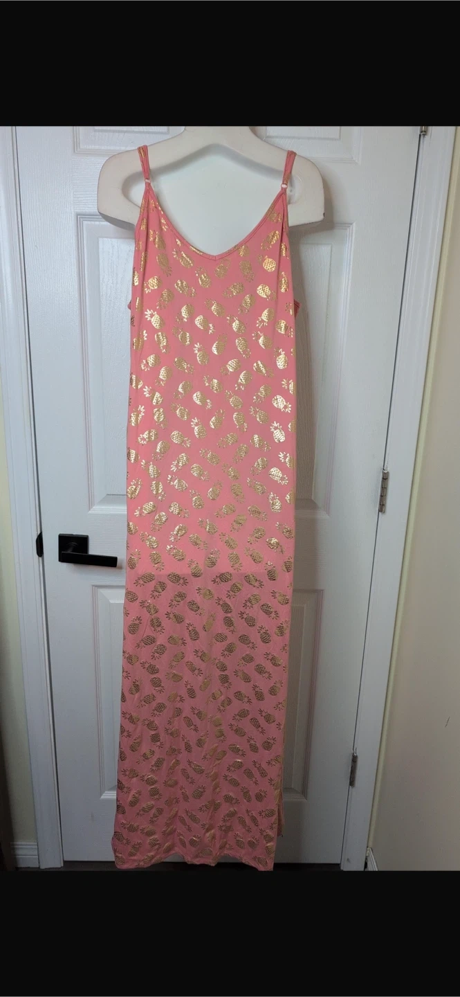 New with tags! This gorgeous ROOTS maxi dress features a fun and vibrant pink color with metallic gold pineapple print throughout. Lightweight and flowy, it’s perfect for summer days, vacations, beach outings, or casual events.