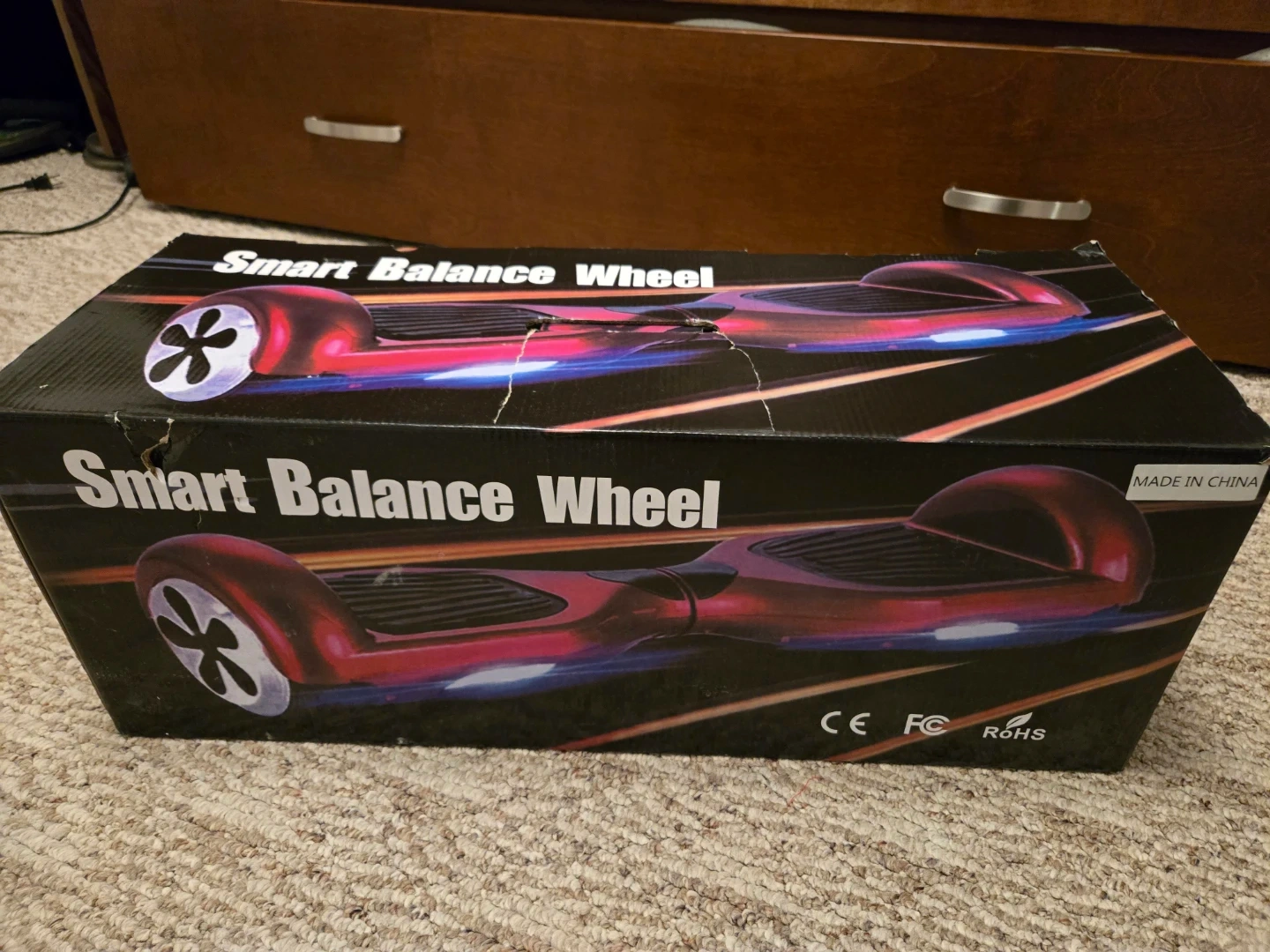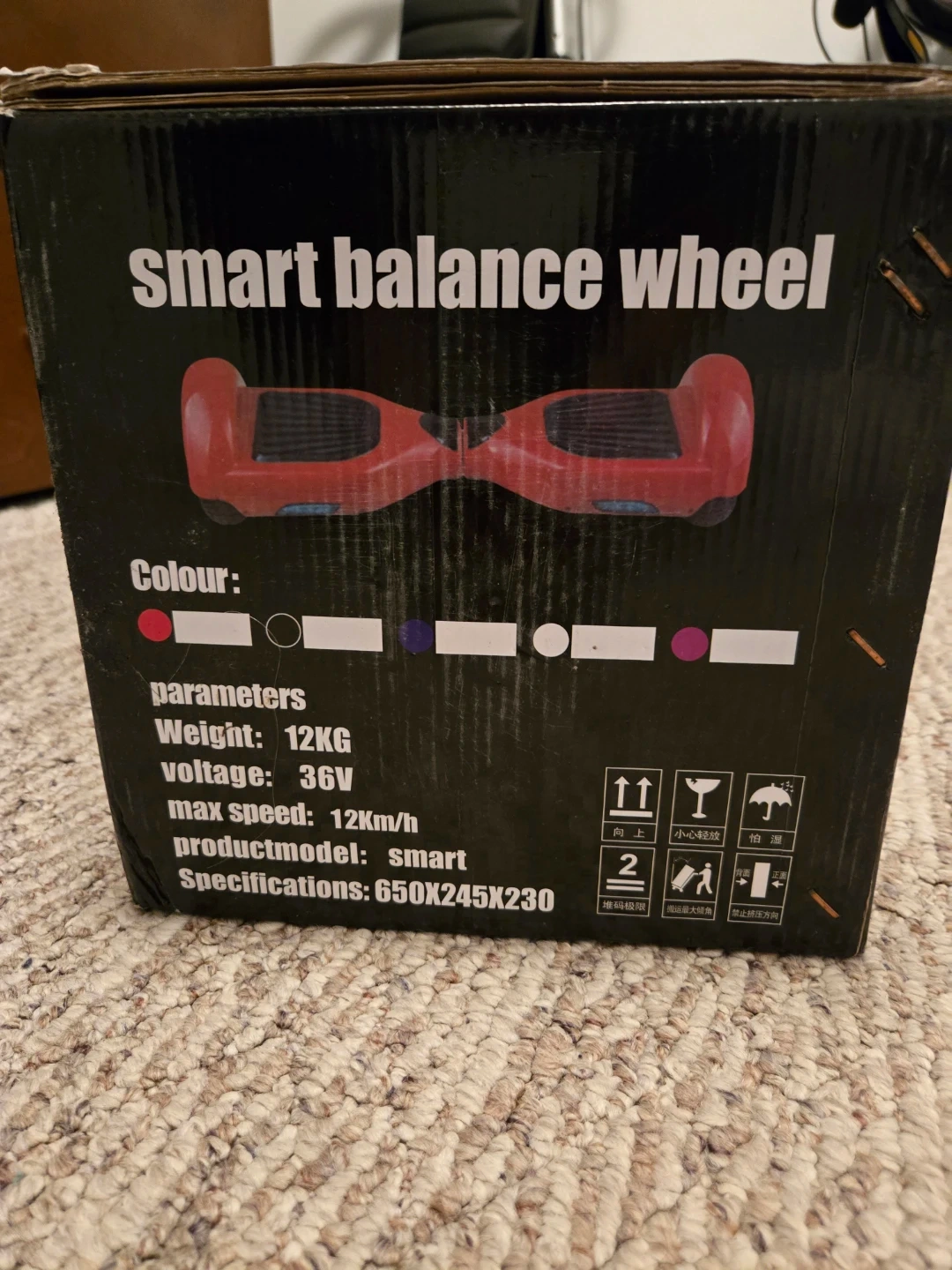 This is a smart balance wheel hoverboard. It weighs 12KG and has a max speed of 12 Km/h. It includes the charger and user's manual. Comes in original box. Never used.