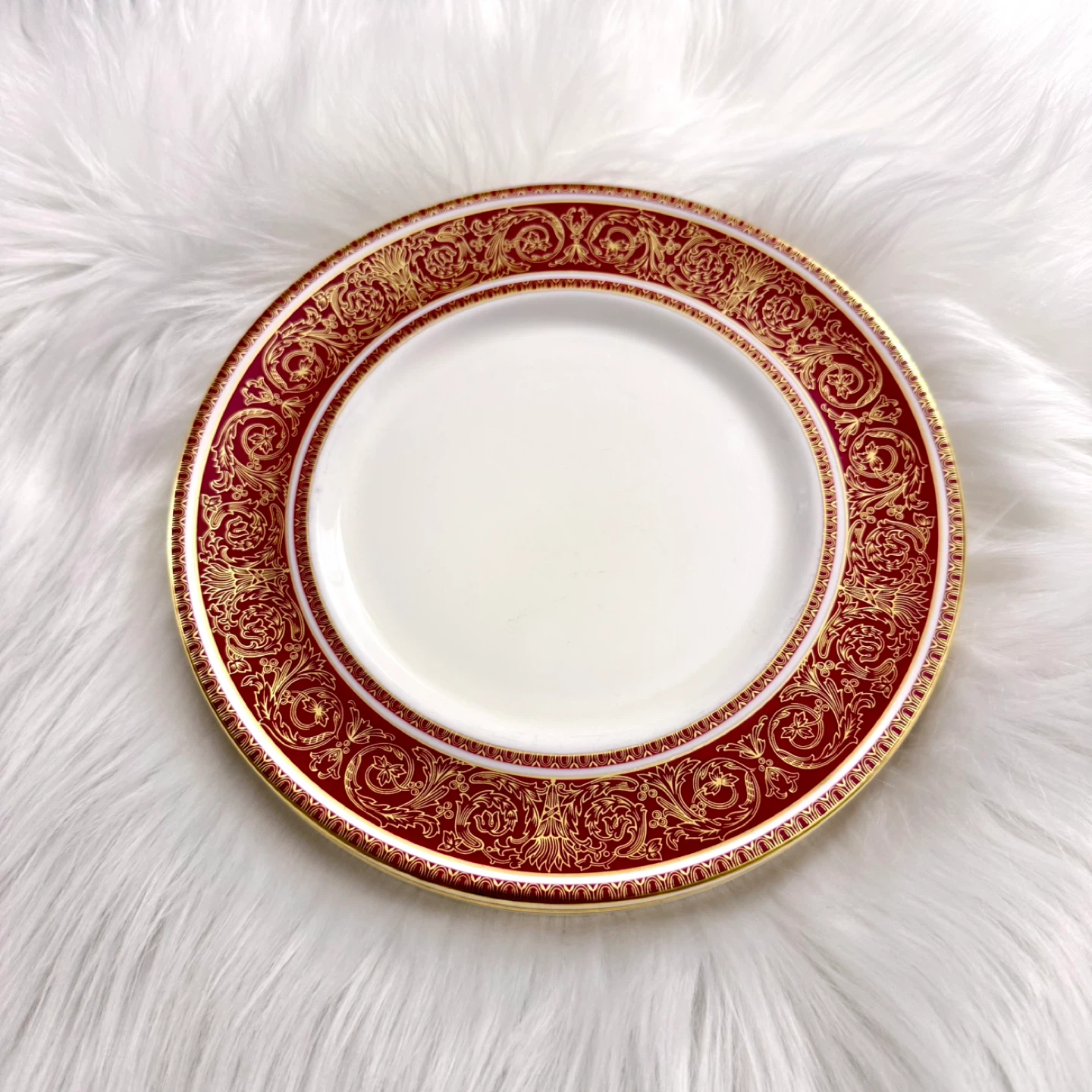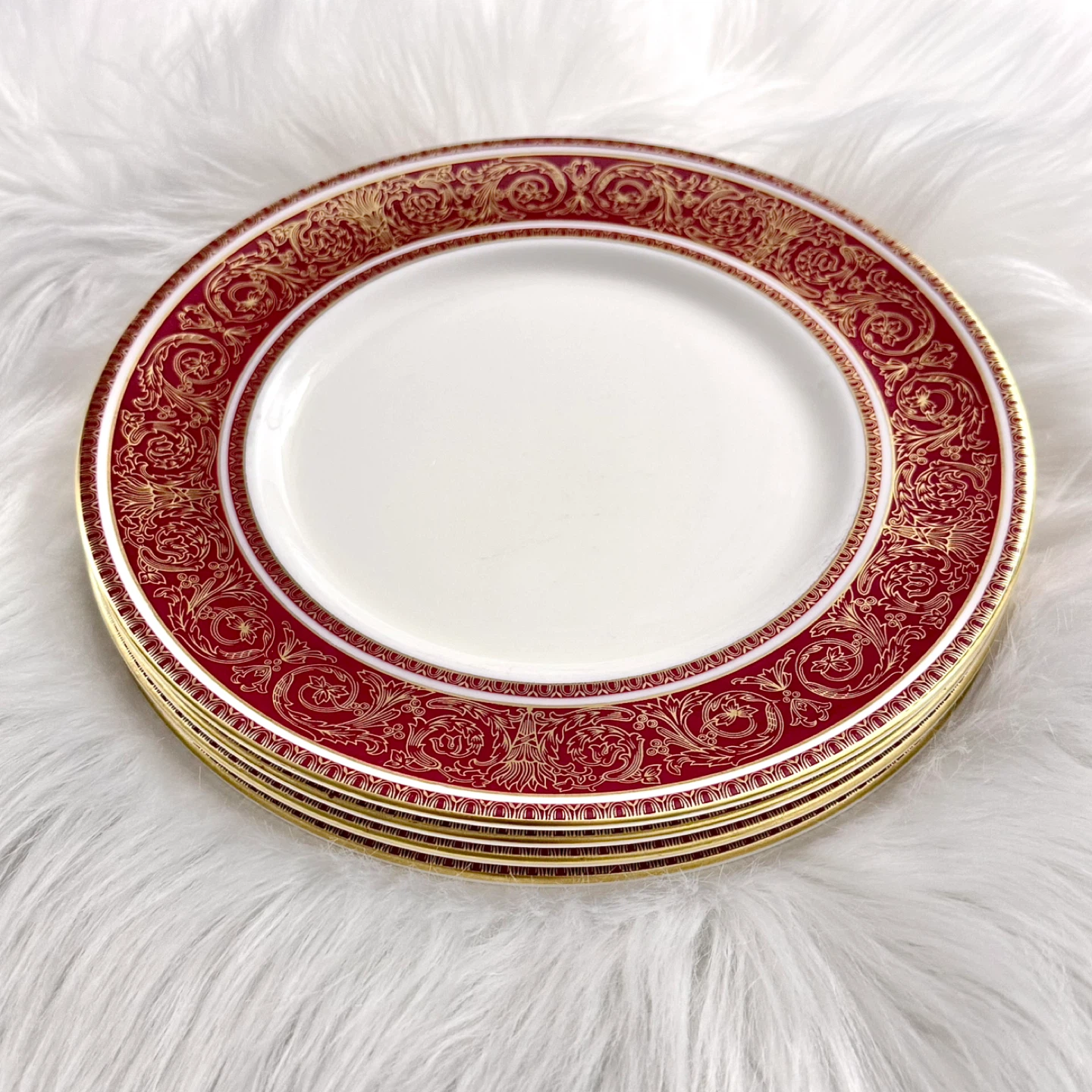 Set of 4 Royal Doulton (made in England) fine bone china 8” diameter plates in Buckingham red pattern. No chips, cracks, crazing or gold loss — all plates ring/ping