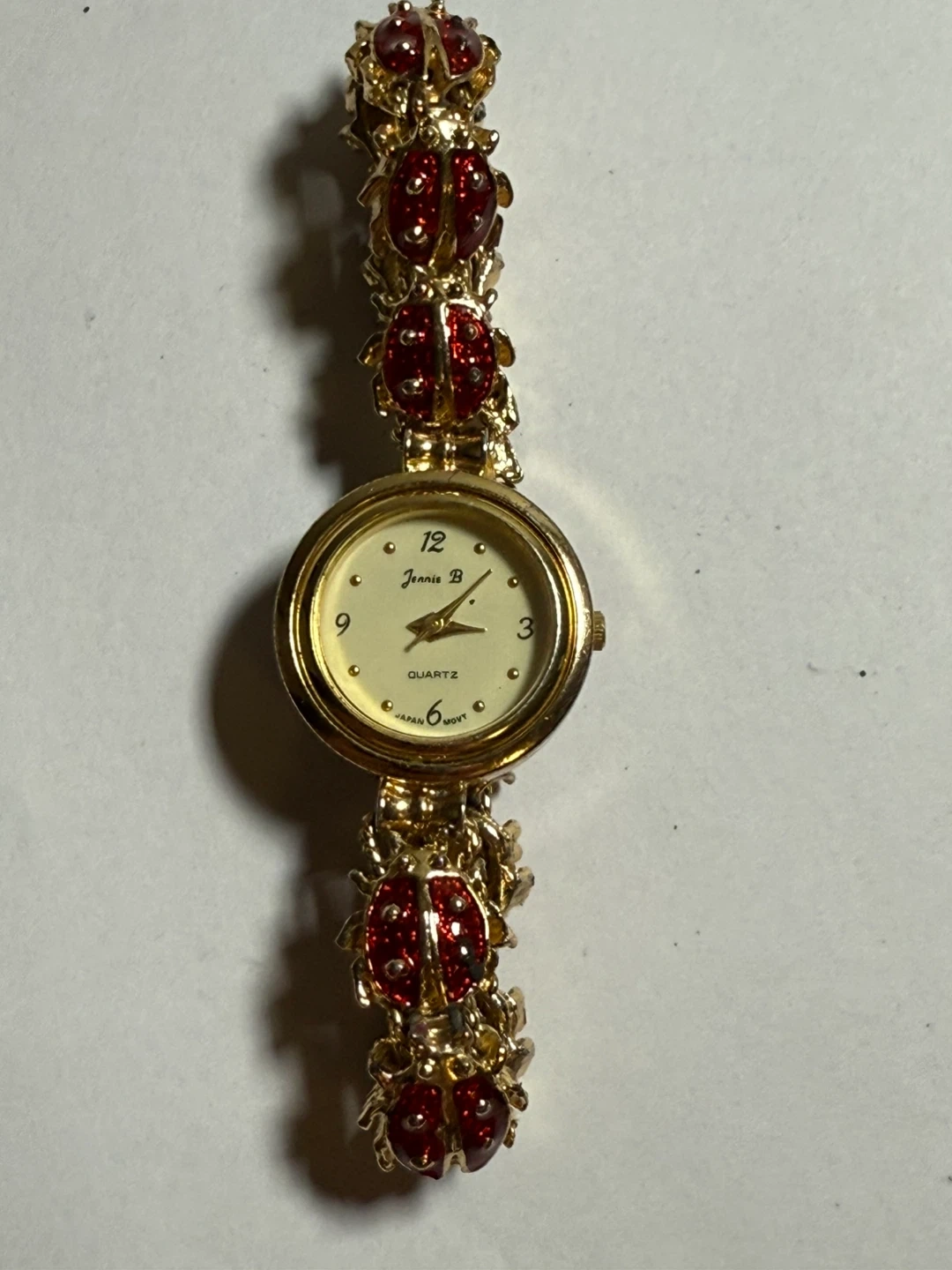 This Jennie B watch has a gold-tone band with red ladybug accents. It features a cream-coloured face with quartz movement. The watch is a charming accessory for any outfit!
