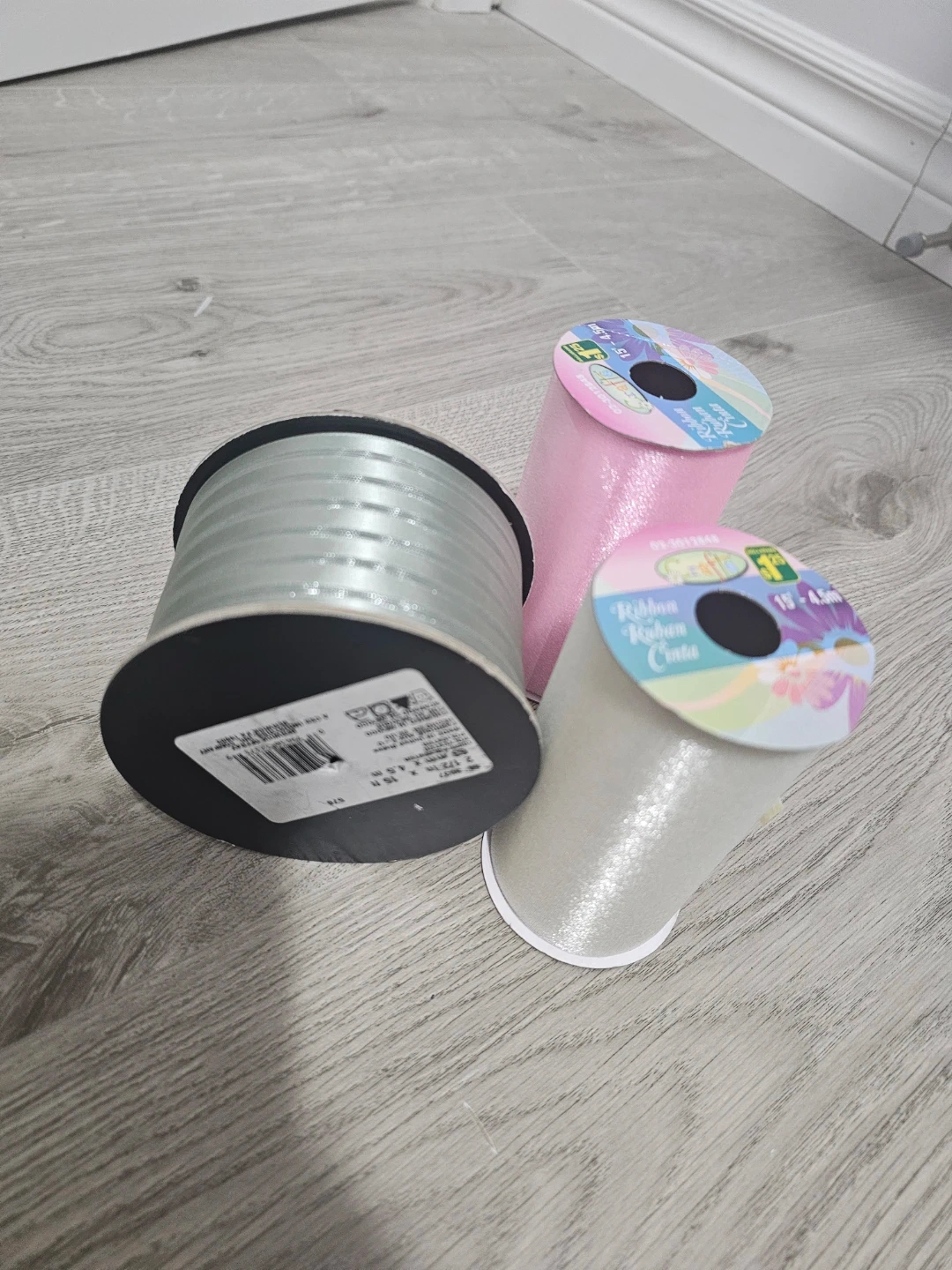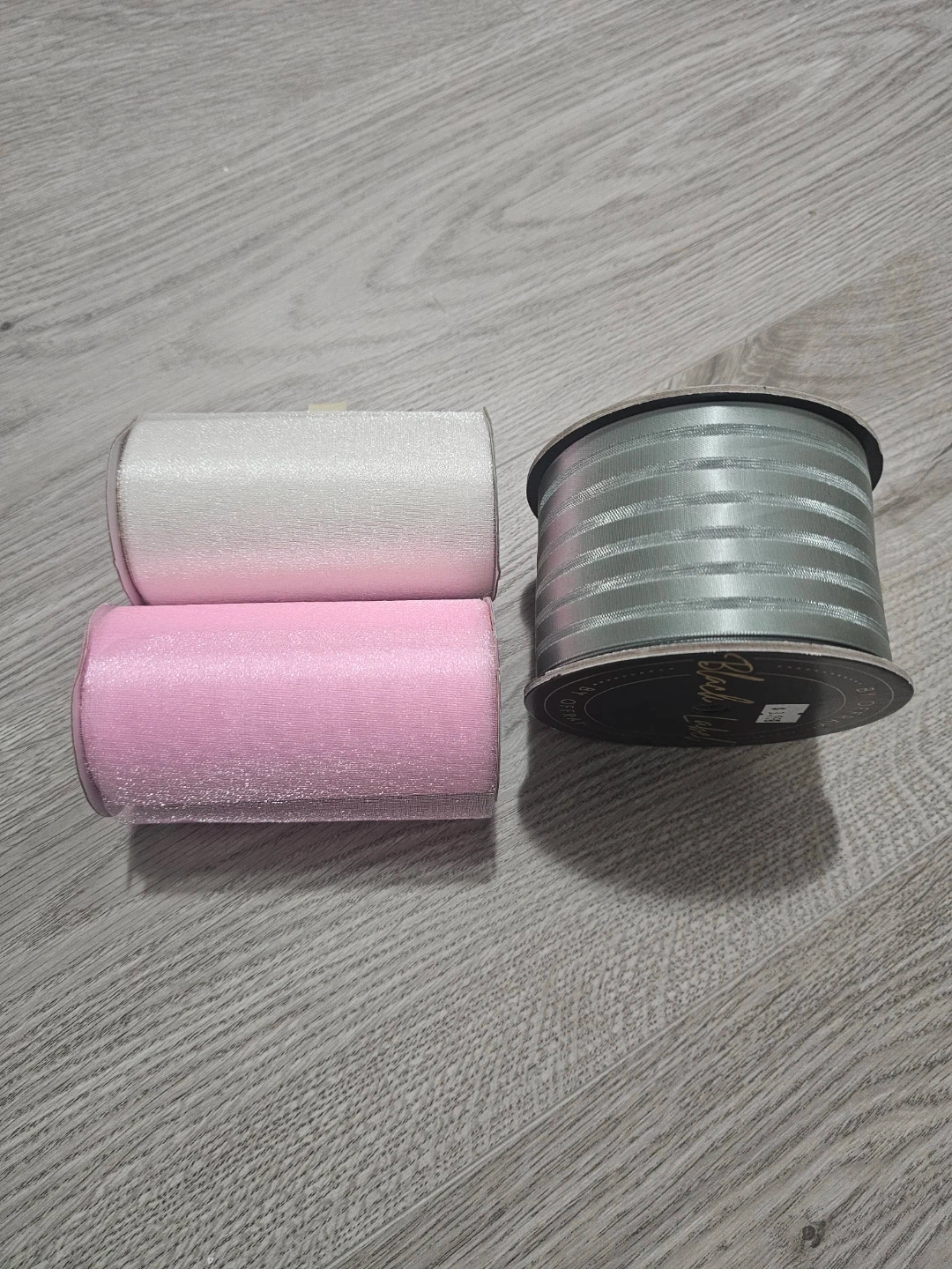 Includes one large spool of silver ribbon and two smaller spools of pink and white ribbon. Perfect for gift wrapping and crafting projects. Ribbon widths vary.