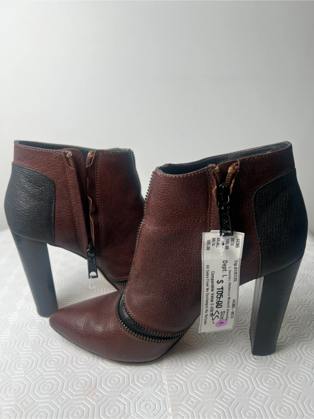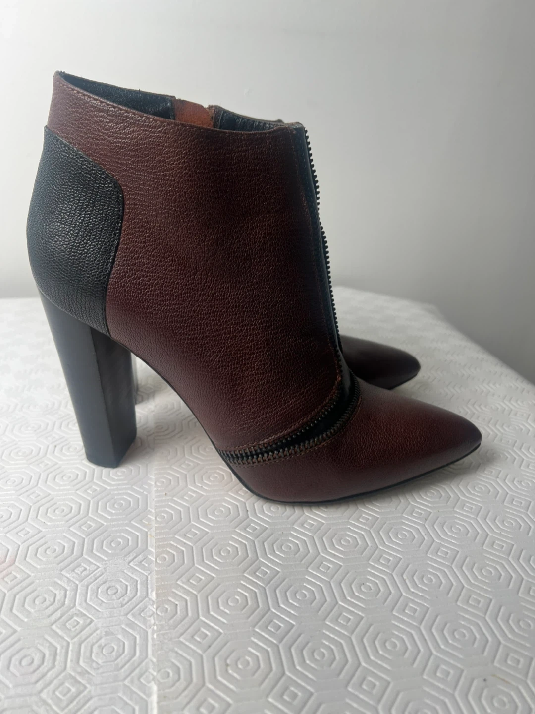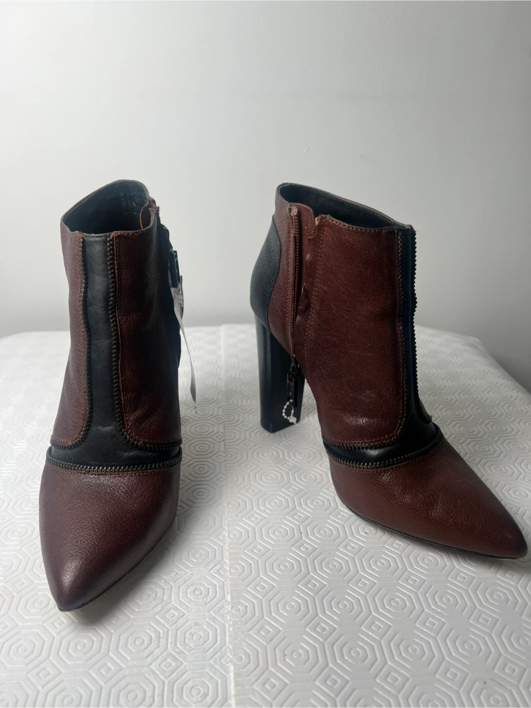 Stylish brown and black leather ankle boots with a pointed toe and side zippers. Features a chunky heel for added height. These boots are a size 7.