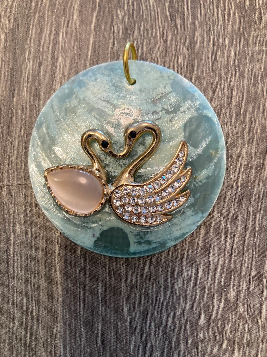 A pretty gold-tone pendant featuring two swans forming a heart shape. One swan has a pearlescent cabochon, while the other's wing is adorned with clear crystals. It has a round, iridescent blue base with a gold bail for hanging.