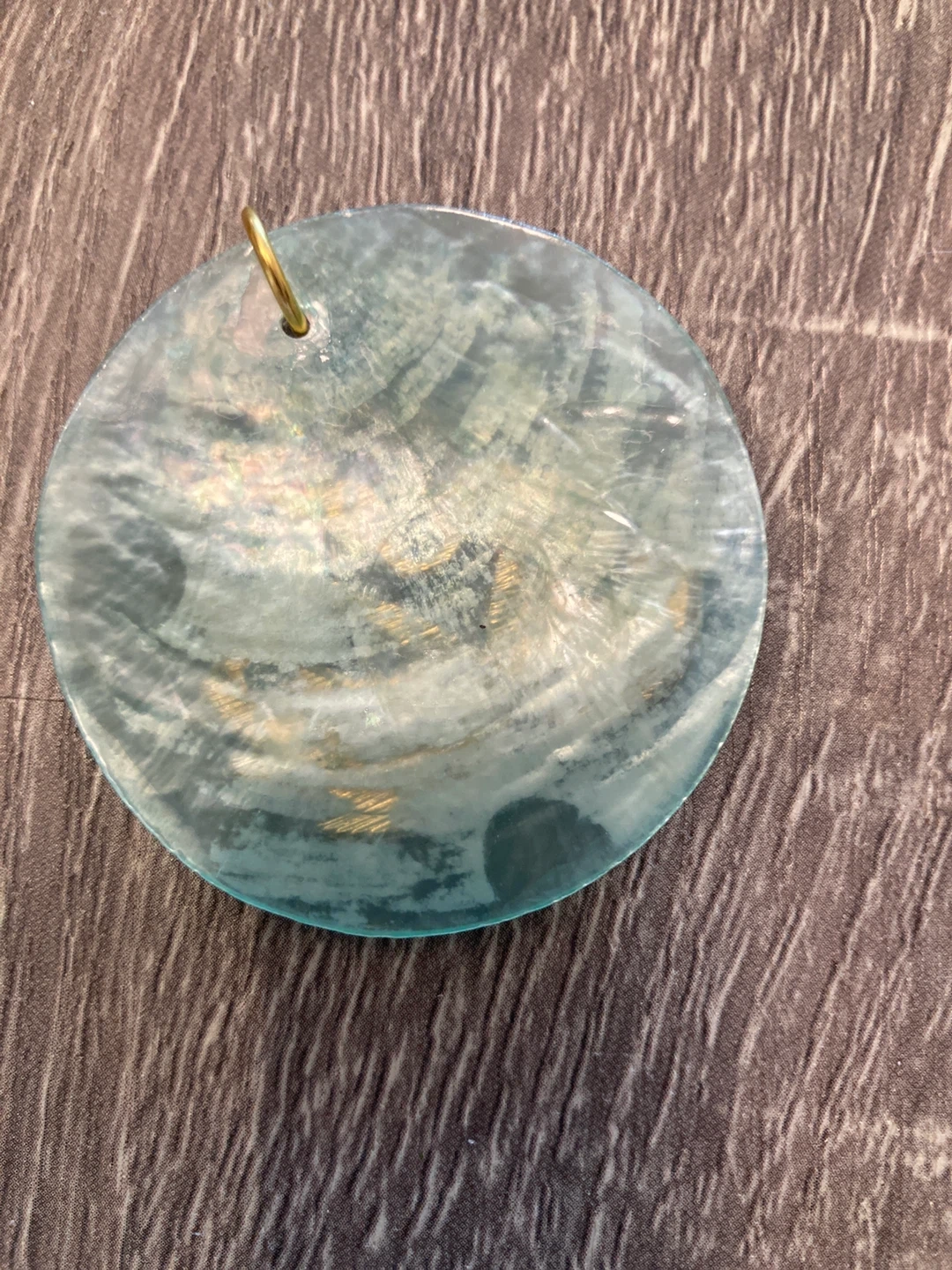 A pretty gold-tone pendant featuring two swans forming a heart shape. One swan has a pearlescent cabochon, while the other's wing is adorned with clear crystals. It has a round, iridescent blue base with a gold bail for hanging.