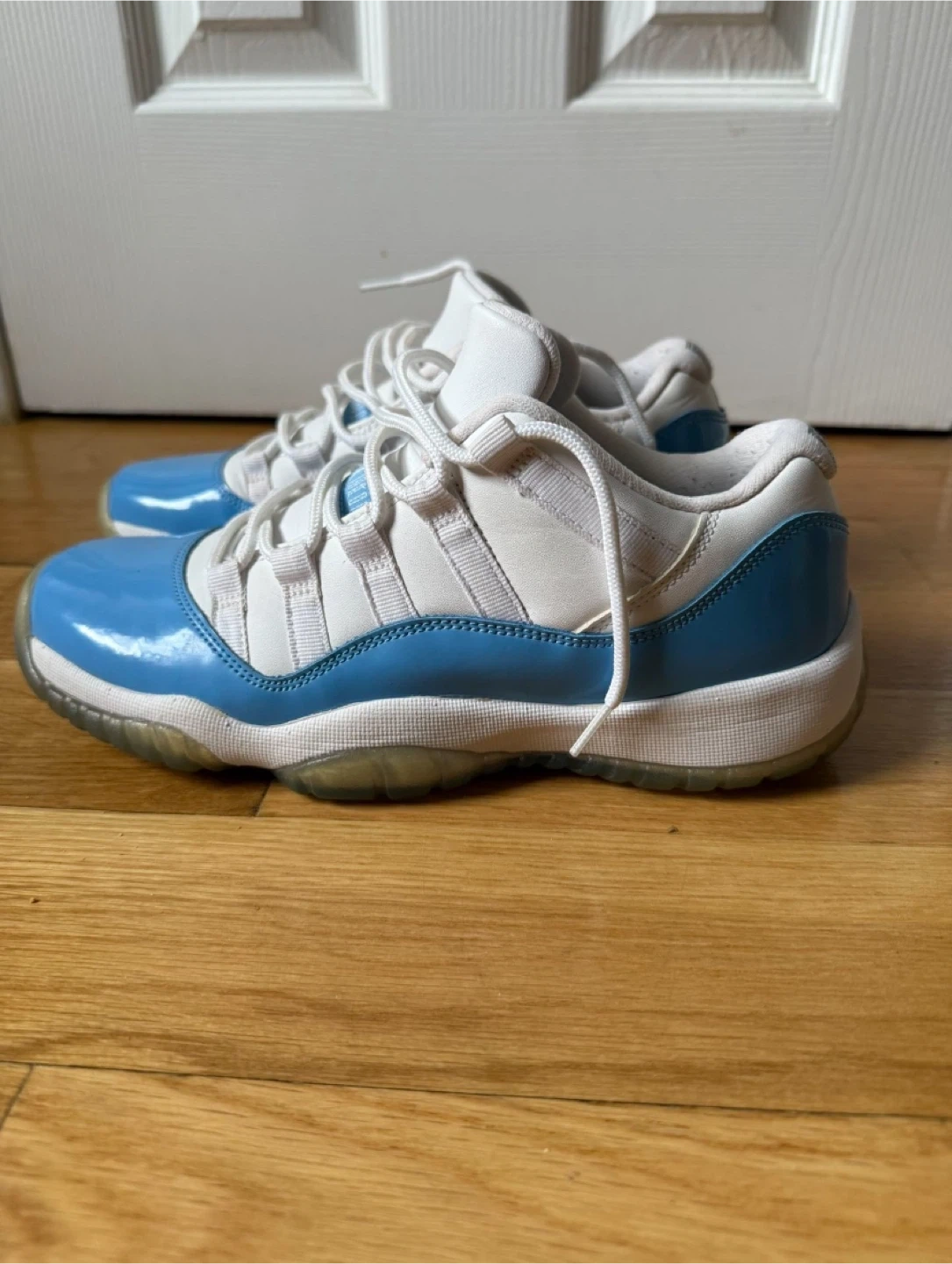 These Air Jordan 11 Lows feature a white and baby blue color scheme. They're made with a mix of leather and patent leather. The translucent outsole shows the iconic Jordan Jumpman logo. These are a classic basketball shoe style.