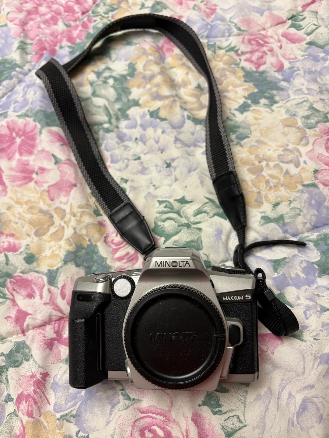 This is a Minolta Maxxum S 35mm film camera. It comes with a black and grey adjustable neck strap. A great camera for film photography enthusiasts!