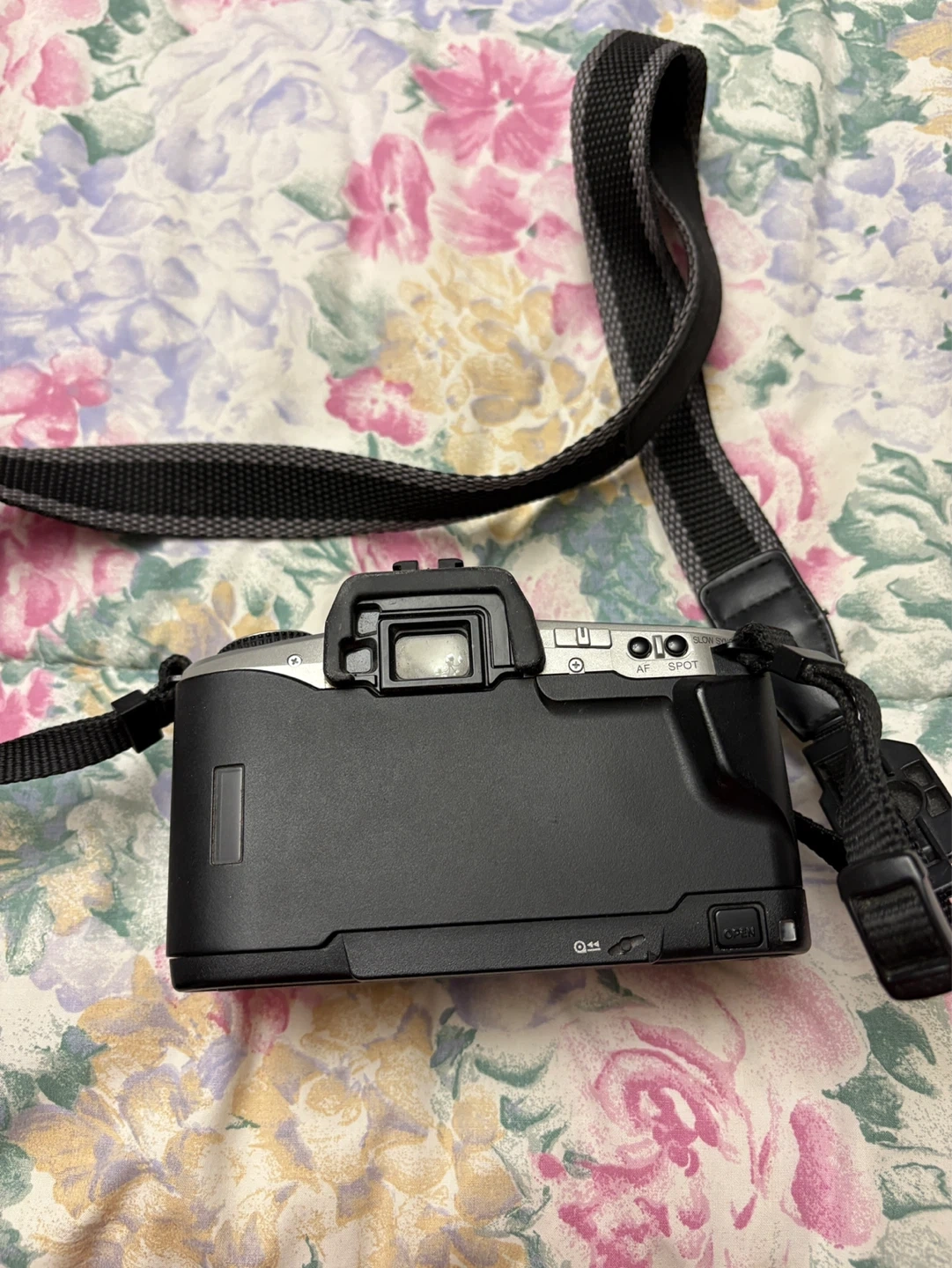 This is a Minolta Maxxum S 35mm film camera. It comes with a black and grey adjustable neck strap. A great camera for film photography enthusiasts!