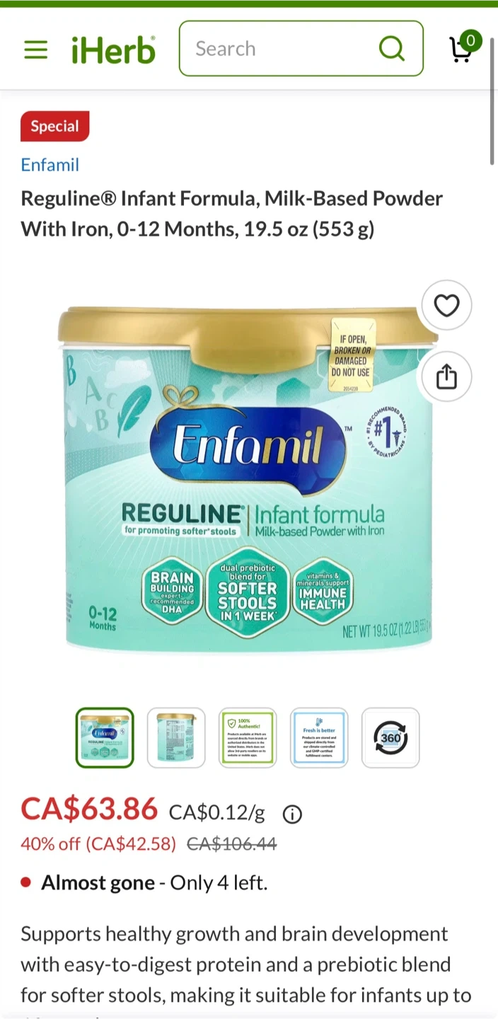 Enfamil Reguline infant formula is milk-based powder with iron. It's designed for promoting softer stools and supports brain development. Suitable for infants aged 0-12 months.