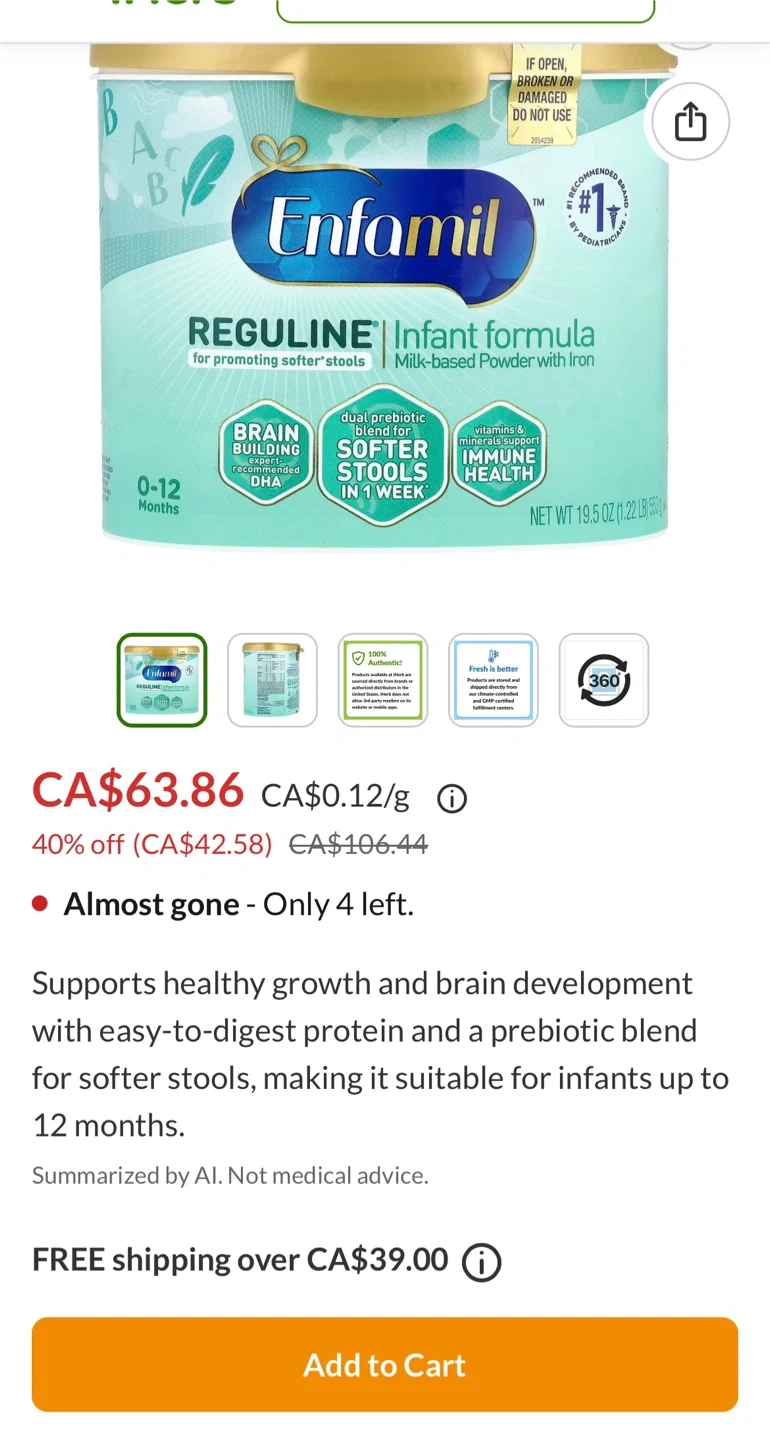 Enfamil Reguline infant formula is milk-based powder with iron. It's designed for promoting softer stools and supports brain development. Suitable for infants aged 0-12 months.