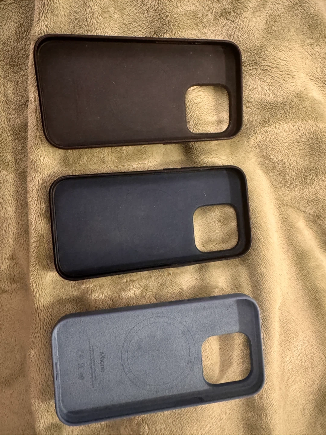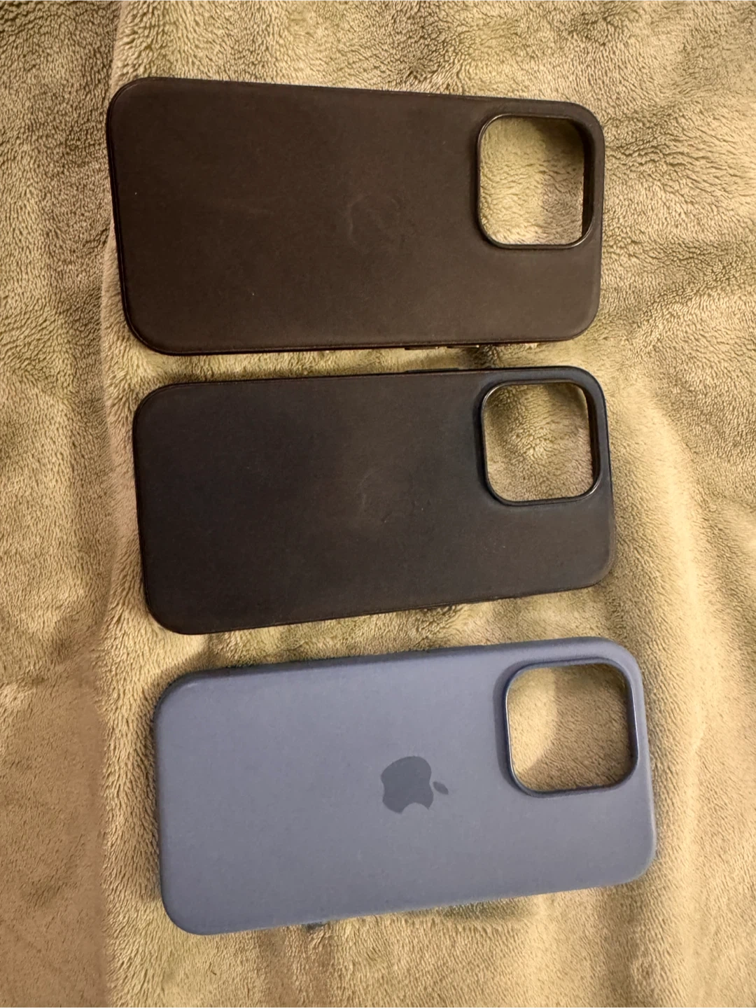 Selling 3 Apple iPhone 15 Pro cases. Includes two black and pacific blue Finewoven cases and one winter blue silicone case. These cases offer MagSafe compatibility for easy charging. They're designed for a snug fit to protect your phone.