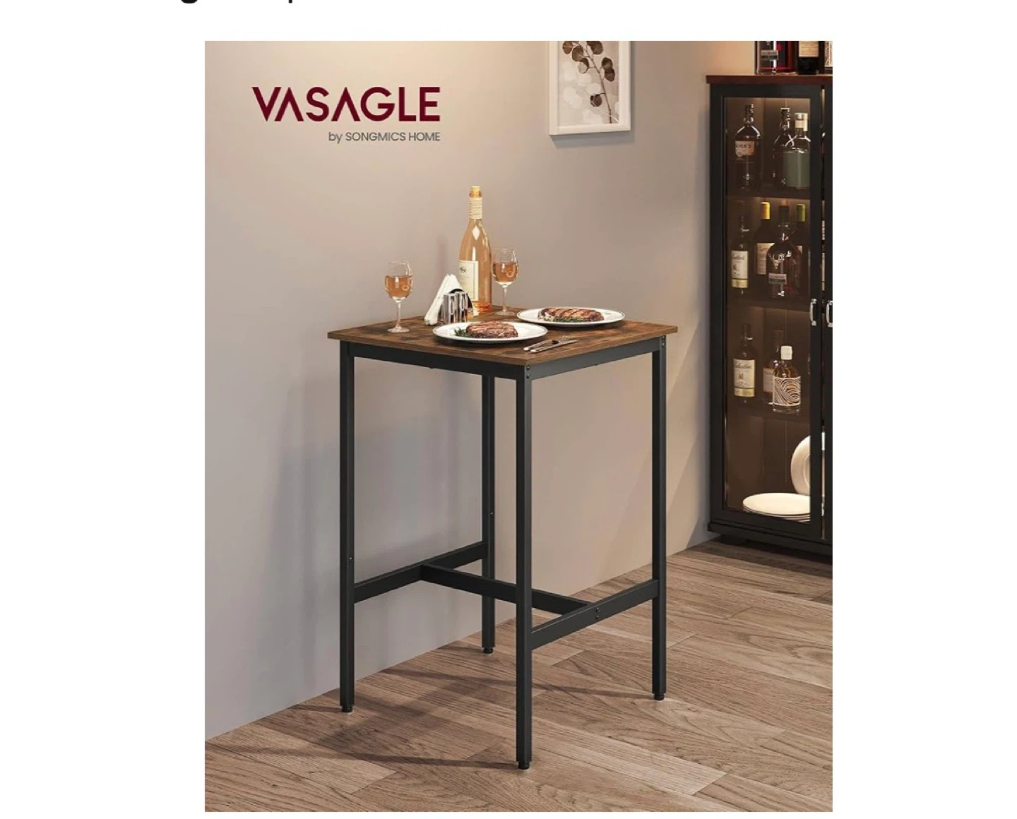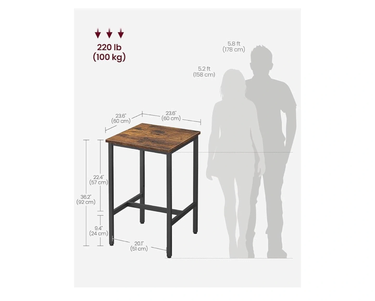 This VASAGLE bar table features a rustic brown tabletop and a black metal frame. It's a compact square table, perfect for small spaces. The table has a tabletop size of 23.6" x 23.6" (60 x 60 cm) and stands 36.2" (92 cm) tall. It's sturdy and can hold up to 220 lb (100 kg).