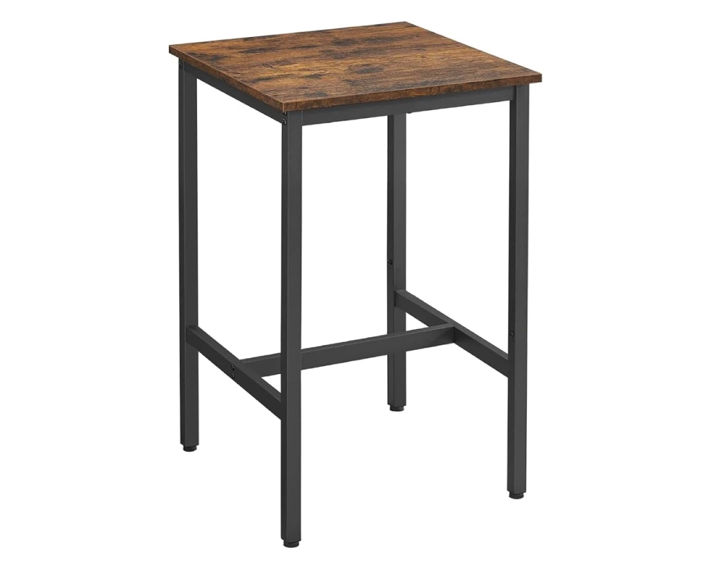 This VASAGLE bar table features a rustic brown tabletop and a black metal frame. It's a compact square table, perfect for small spaces. The table has a tabletop size of 23.6" x 23.6" (60 x 60 cm) and stands 36.2" (92 cm) tall. It's sturdy and can hold up to 220 lb (100 kg).