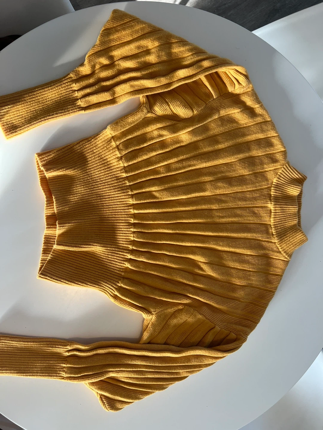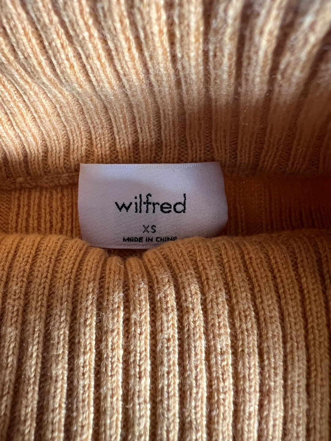 This is a Wilfred yellow ribbed sweater. It features a mock neck and long sleeves with a fitted silhouette. Size XS. Made in China.