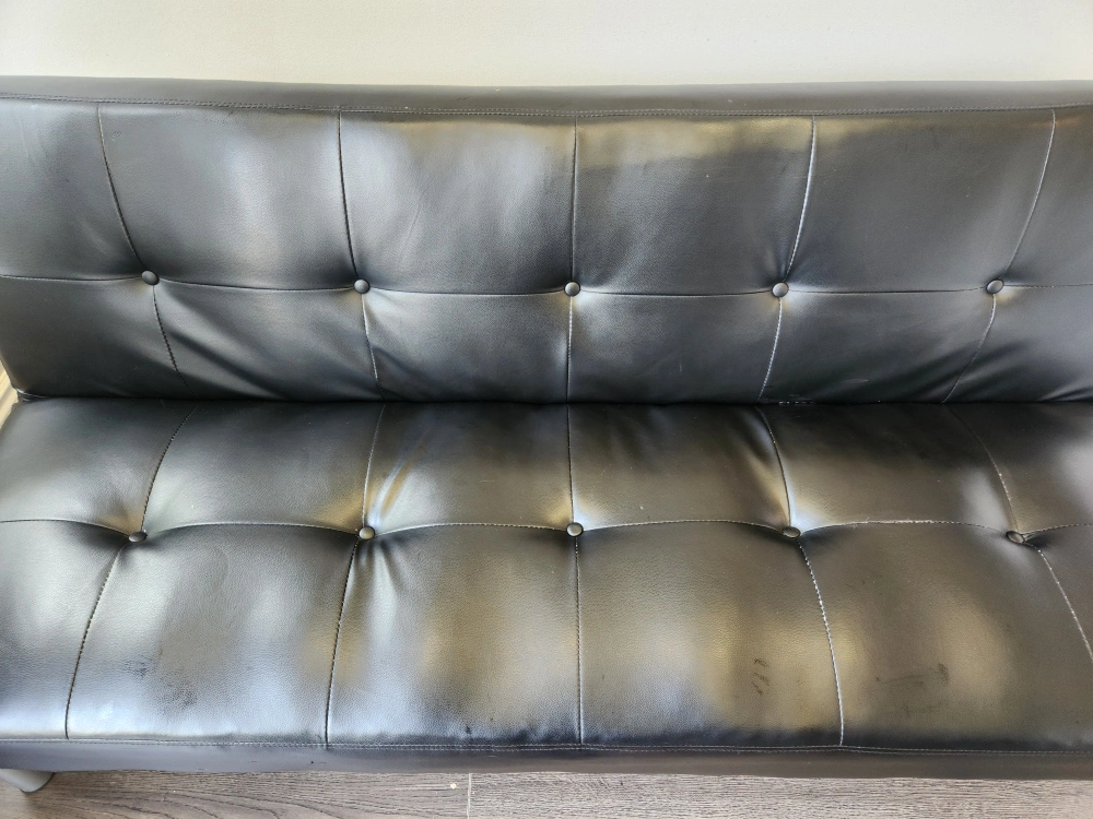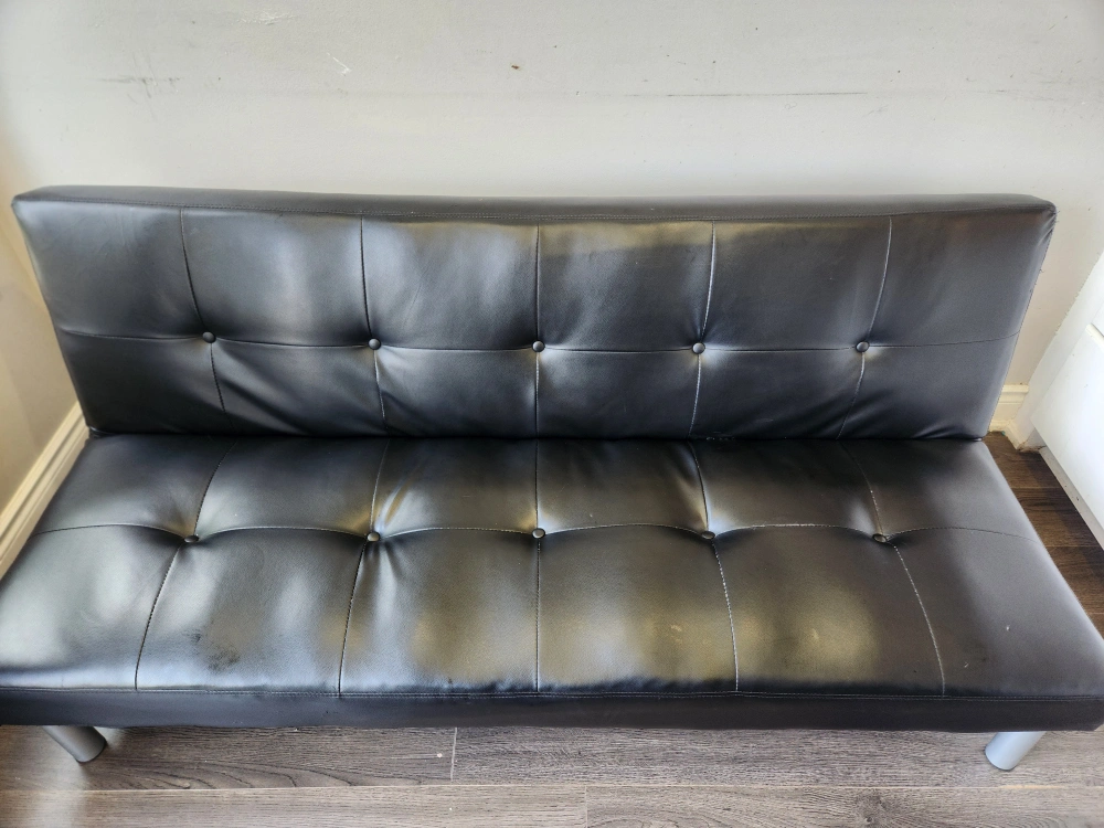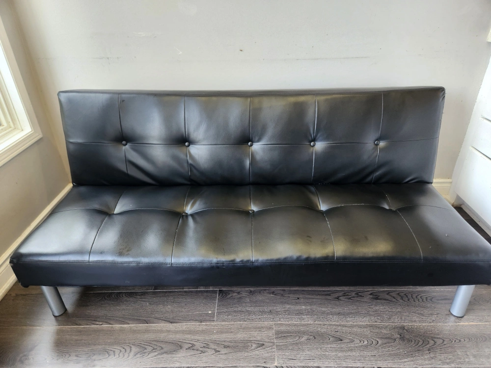 Selling a black futon that's in great condition. It's perfect for a living room or spare room. The futon features a sleek design and silver-colored legs. It's a comfortable and stylish.