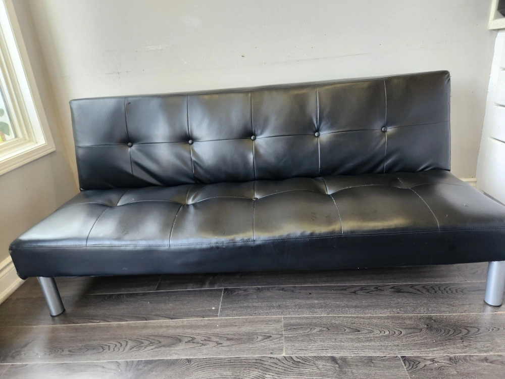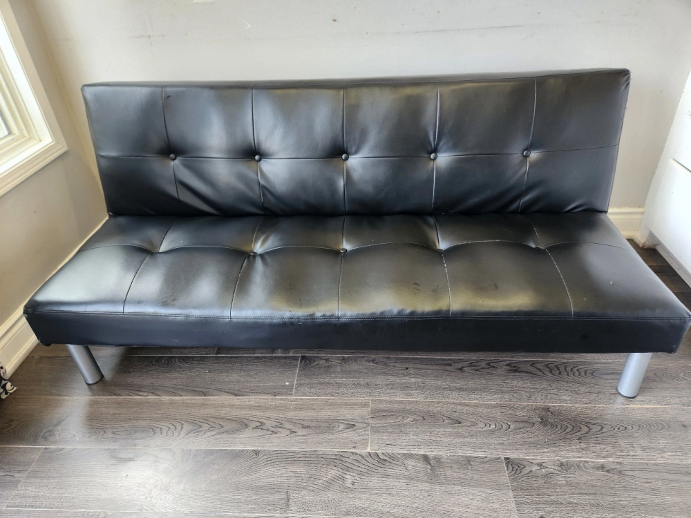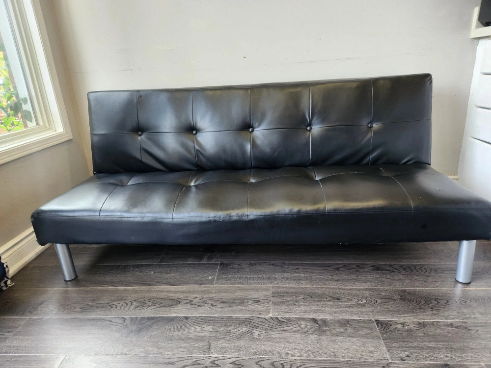 Selling a black futon that's in great condition. It's perfect for a living room or spare room. The futon features a sleek design and silver-colored legs. It's a comfortable and stylish.