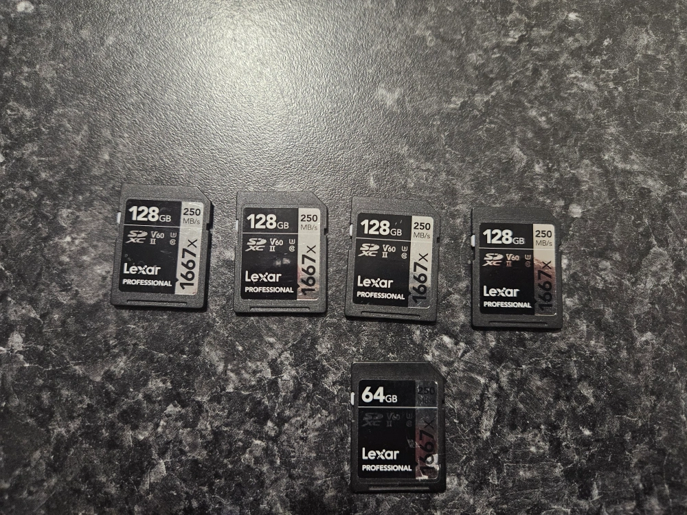 Five Lexar Professional SD cards. Four are 128 GB and one is 64 GB. 250 MB/s read speeds. 1667x cards.