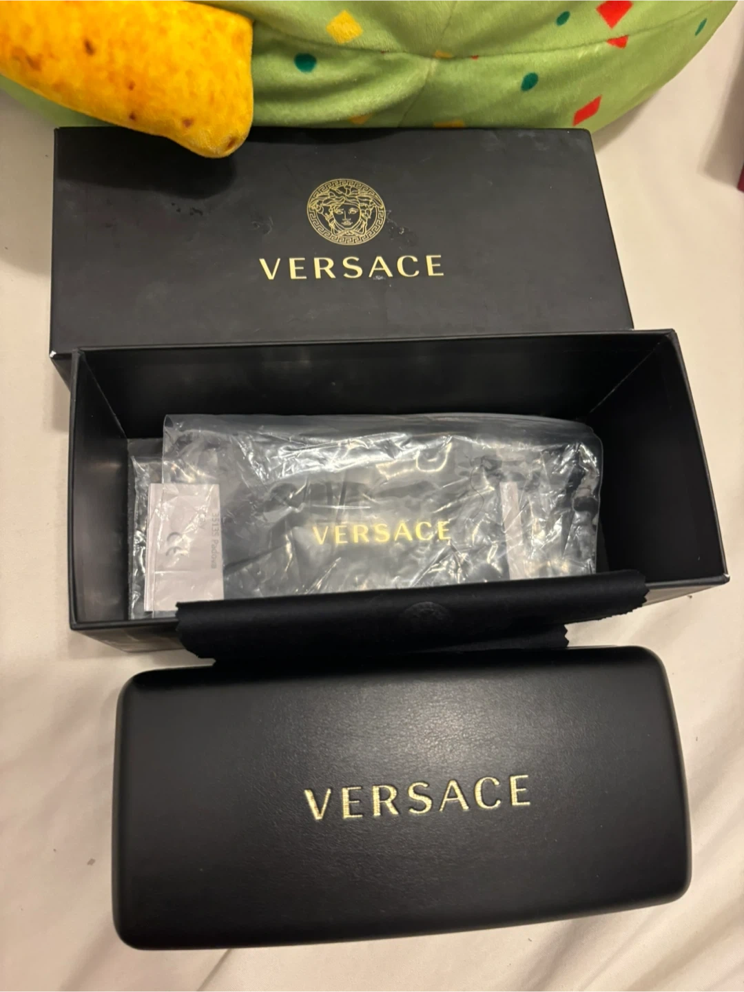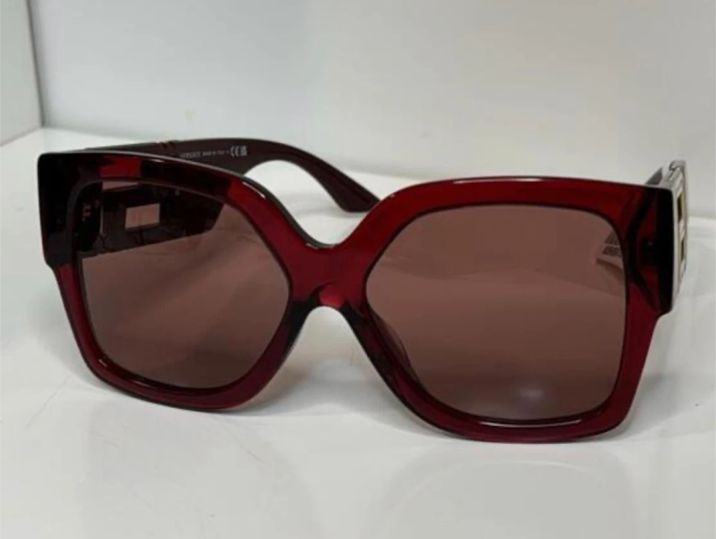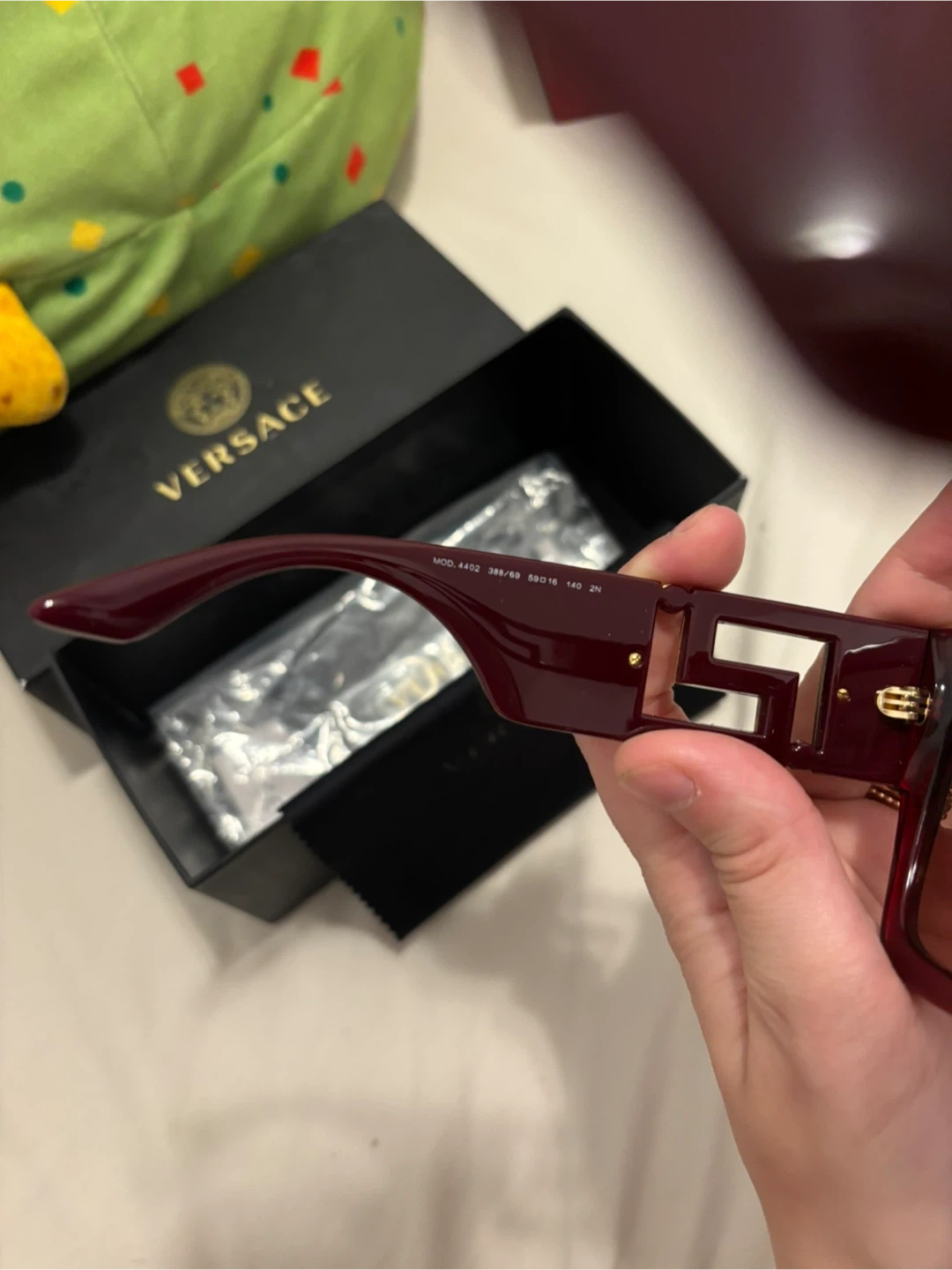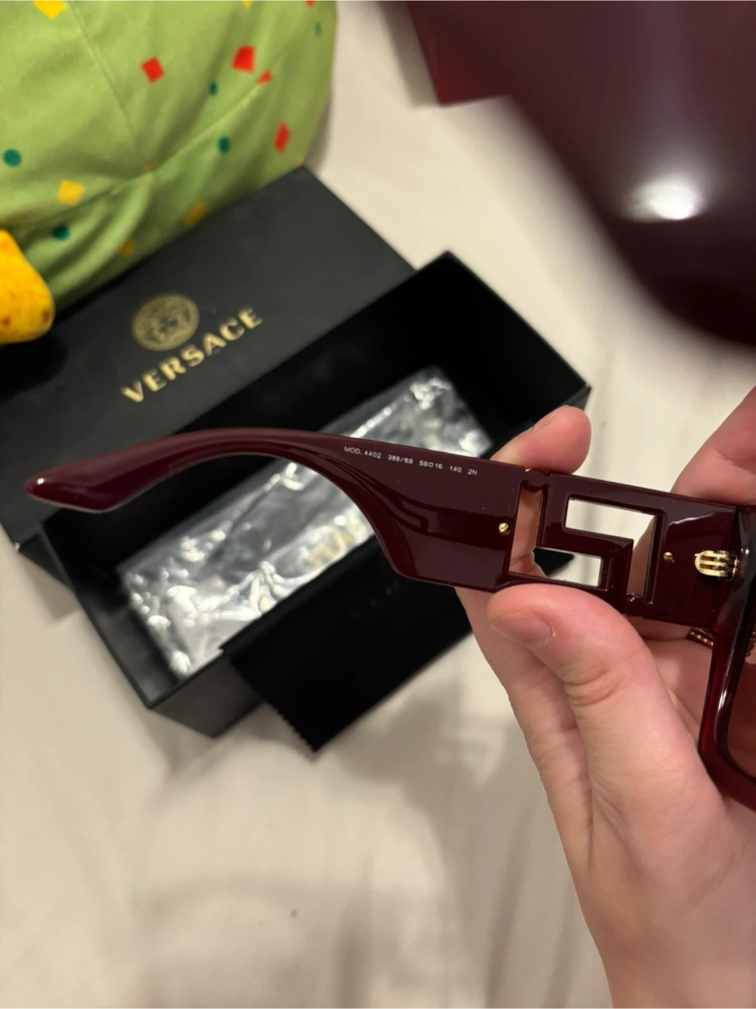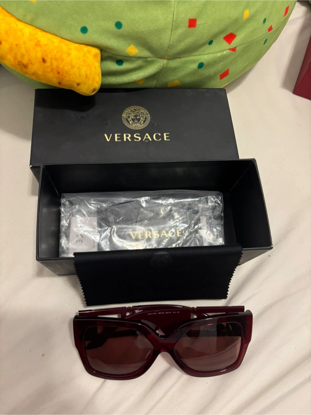 Selling a pair of Versace sunglasses, model MOD.4402. They come in a beautiful burgundy colour and include the original box and cleaning cloth. The sunglasses have a stylish design with the Versace logo on the sides. They are new and ready for a new owner!