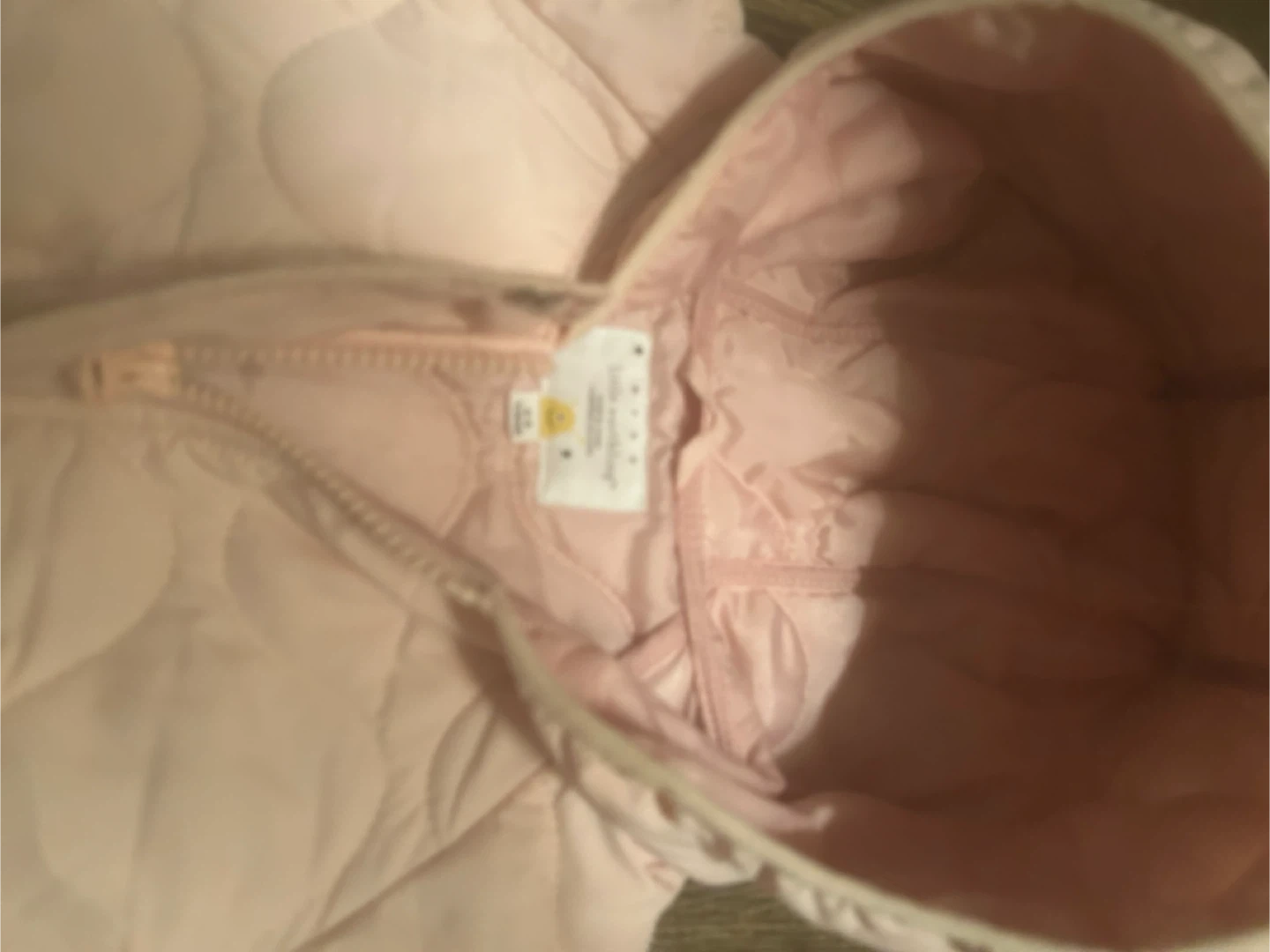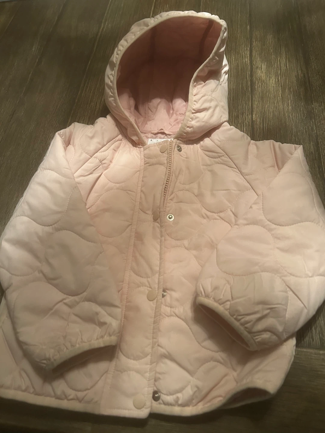 This is a sweet pink quilted hooded jacket for a child. It features a full zip closure and snap buttons for extra security. It's lined with soft fabric for comfort. Size 4/5