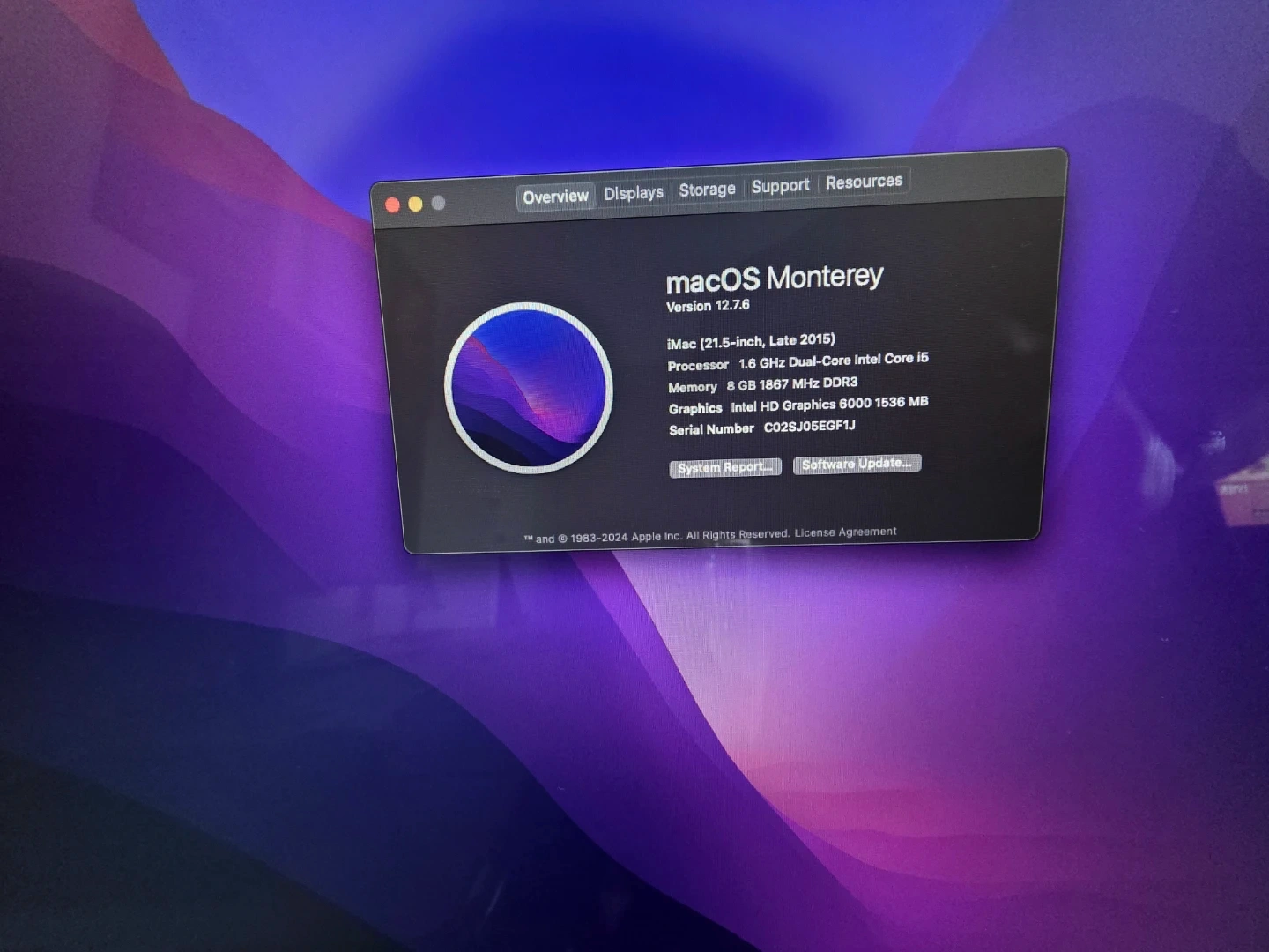 This is a Late 2015 Apple iMac with a 21.5-inch display. It's running macOS Monterey 12.7.6 and features a 1.6 GHz dual-core Intel Core i5 processor. It has 8 GB of 1867 MHz DDR3 RAM and a 512 GB SATA Solid State Drive for storage. It's a solid machine for everyday tasks!