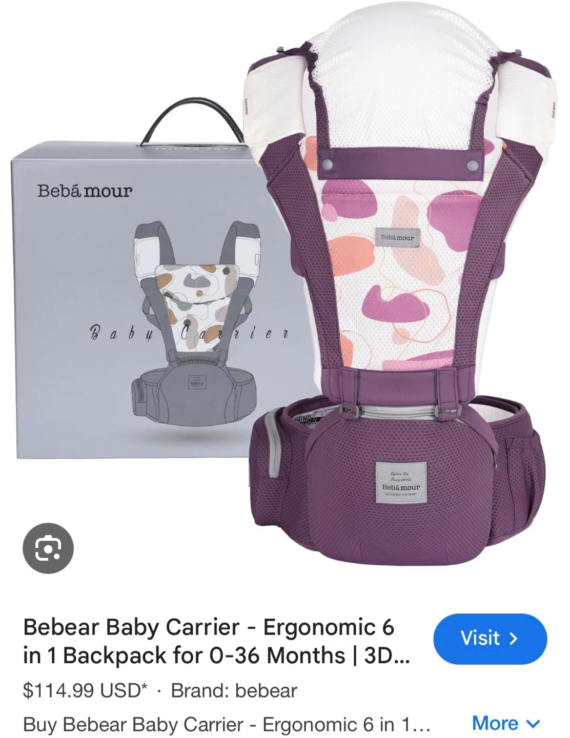 Bebear baby carrier is designed for newborns to toddlers, ages 0-36 months. It's an ergonomic 6-in-1 backpack style carrier with 3D air mesh. It can be converted into a single hip seat.