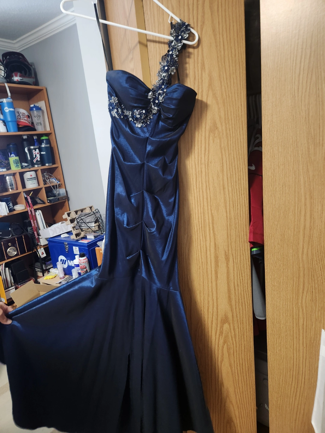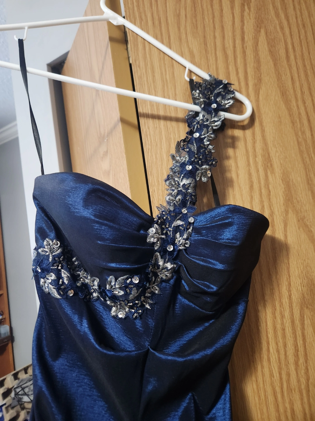 Beautiful navy blue formal gown. One-shoulder design. Features delicate floral embellishments with silver accents. Fitted silhouette with a mermaid/trumpet skirt. Perfect for prom, a wedding, or other special occasion.