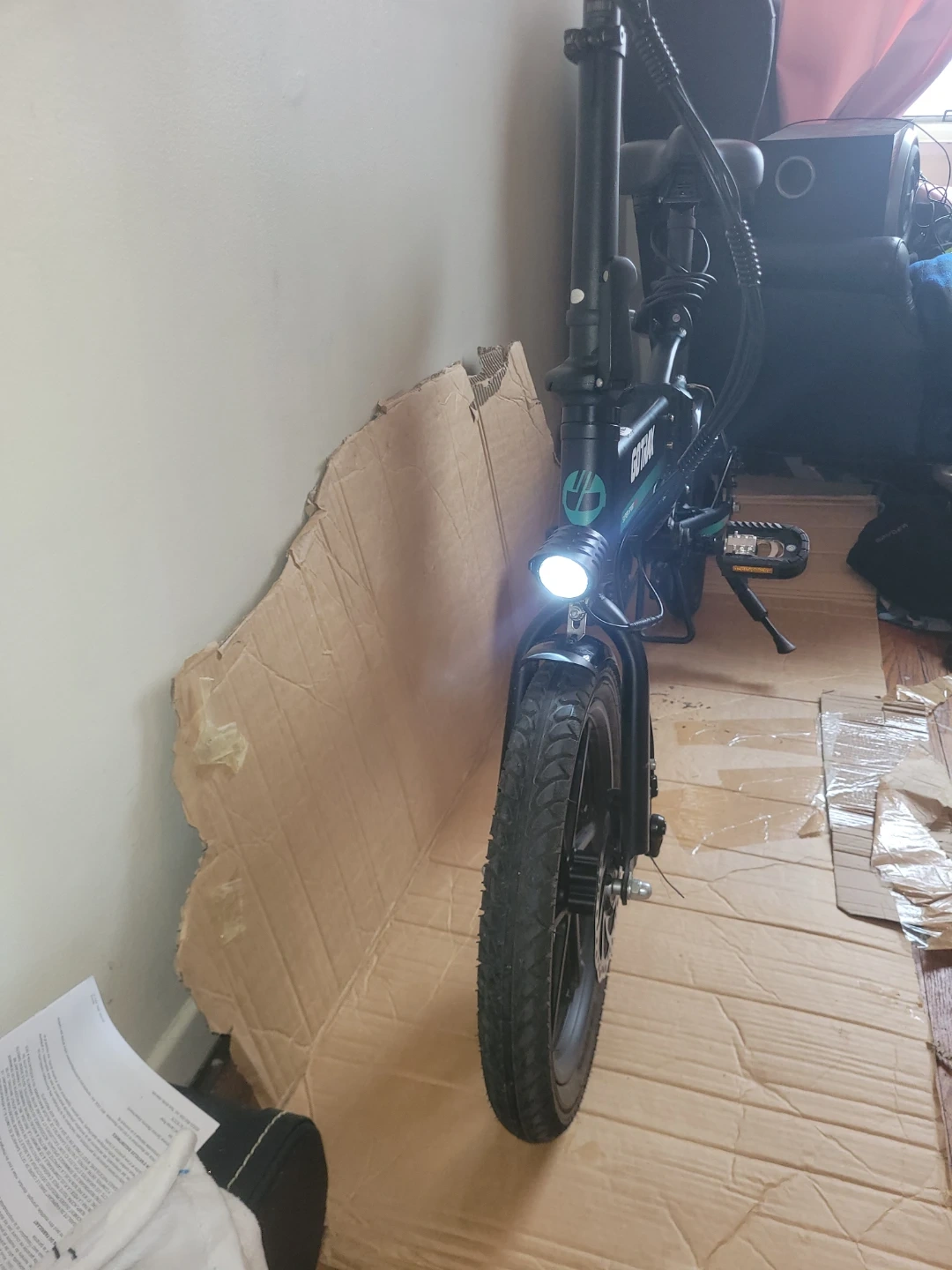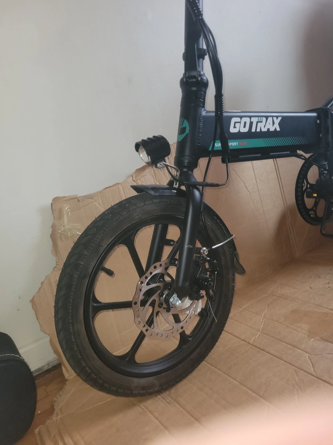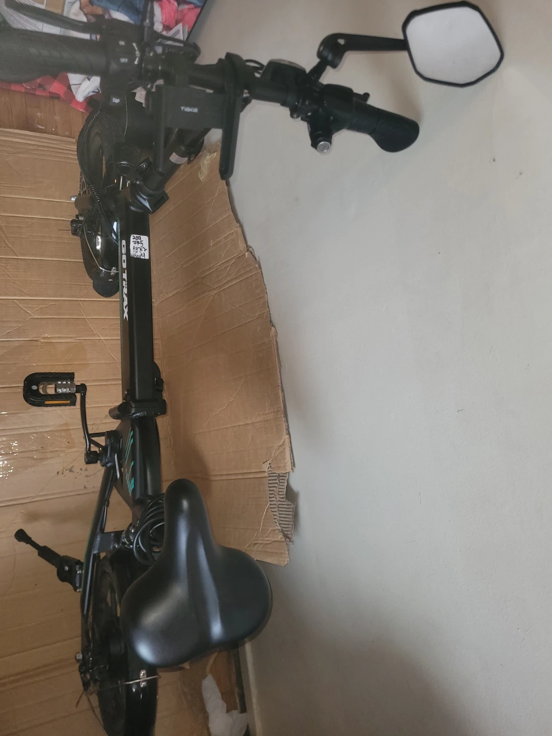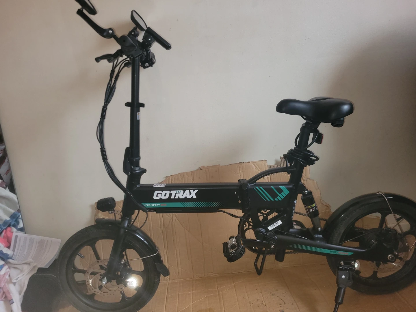 GoTrax Super Sport electric folding bike. It's black with teal accents. Features include foldable frame, disc brakes, and a built-in headlight. Great for commuting or recreational rides! Bike has mirrors added on for added safety and a phone mount.