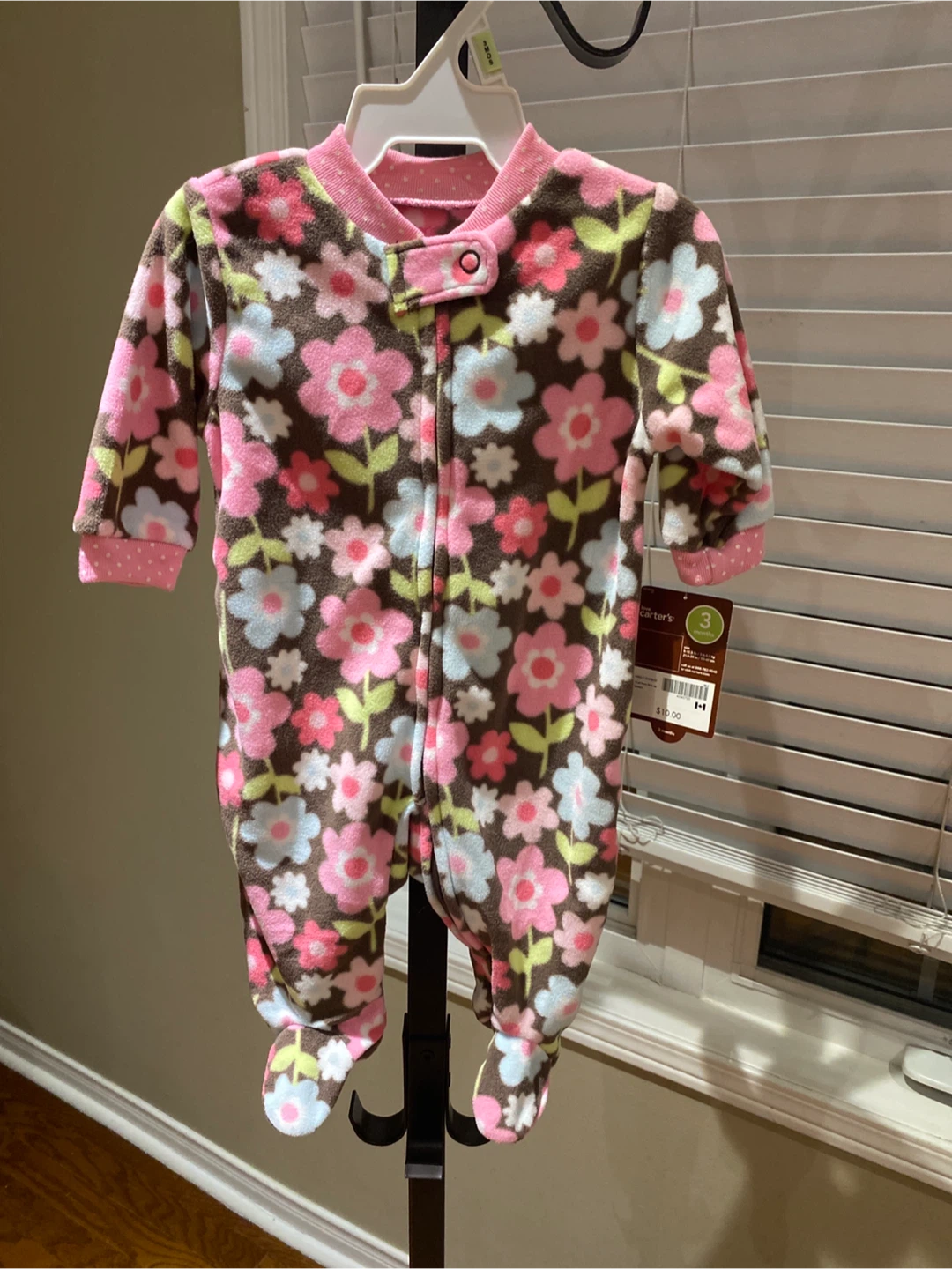 Carter's baby girl's cozy fleece footie pajamas. Features a sweet floral print with pink, blue, and white flowers on a brown background. Size 3 months. Perfect for keeping your little one warm!