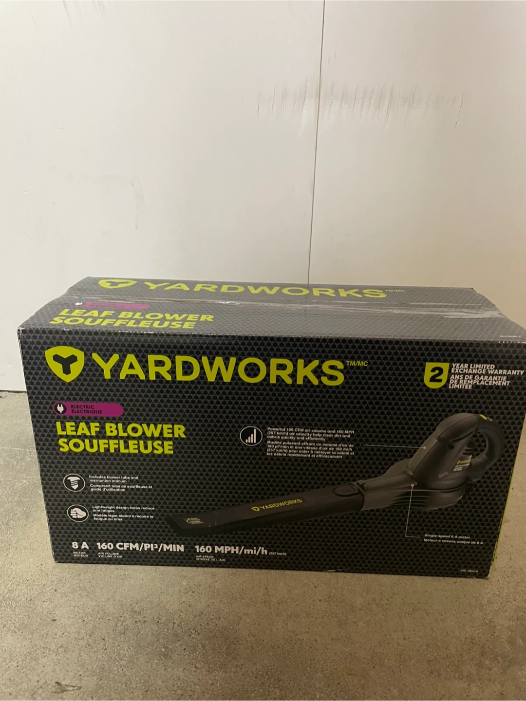 Yardworks electric leaf blower in its original packaging. It includes the blower tube and is rated for 8 amps. Offers 160 MPH air speed.