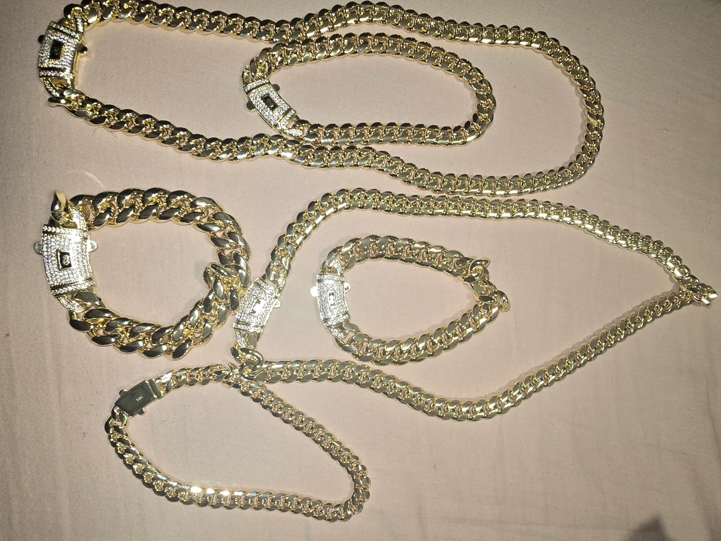 Selling a beautiful gold Cuban link chain and matching bracelet set. The set is in great condition and features a detailed, iced-out class. Perfect for adding some shine to your look!