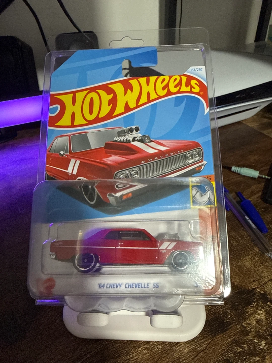 Brand new Hot Wheels '64 Chevy Chevelle SS in its original packaging. This die-cast model features a classic red finish with racing stripes. It's part of the 2023 collection, numbered 157/250.