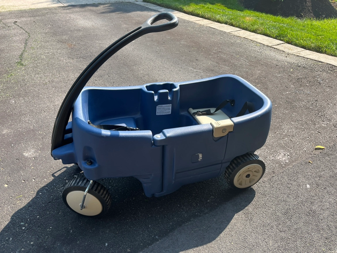 Blue wagon with handle and seat. Good condition. Used just a few times so still looks good. All of the wheels turn smoothly.
