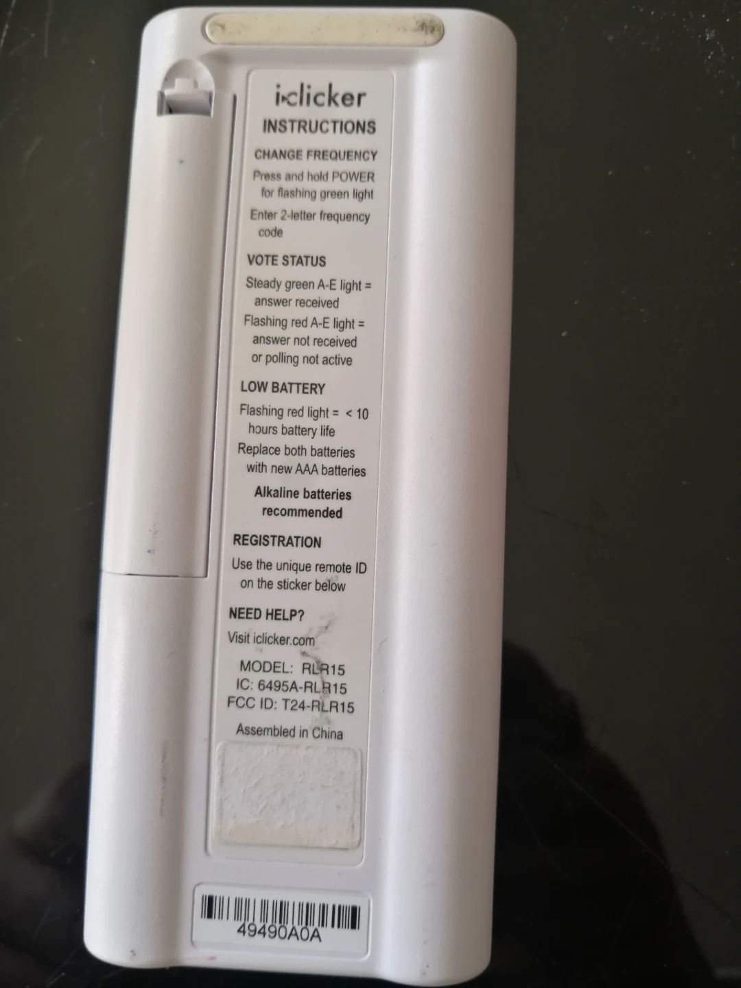 This is an iClicker+ remote, model RL R15. It's white and requires two AAA batteries, which are not included. It has buttons A through E for voting.