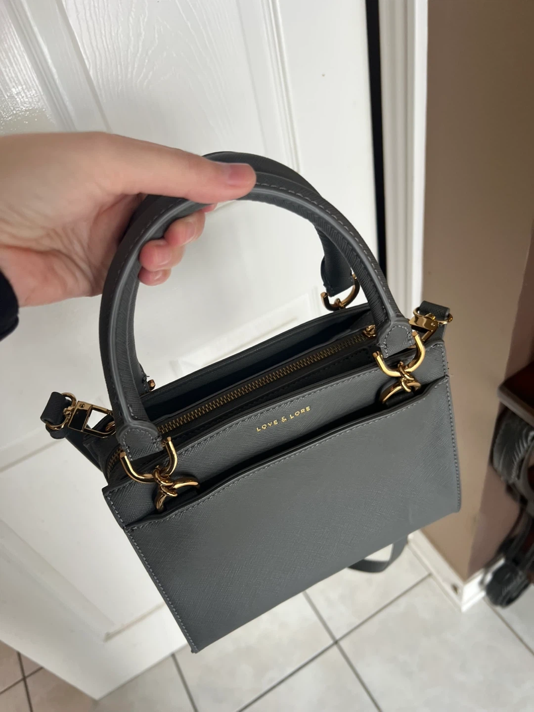 This is a Love & Lore grey satchel purse with gold hardware. It's made of saffiano faux leather and includes a detachable crossbody strap. It has a zippered main compartment and a front slip pocket.
