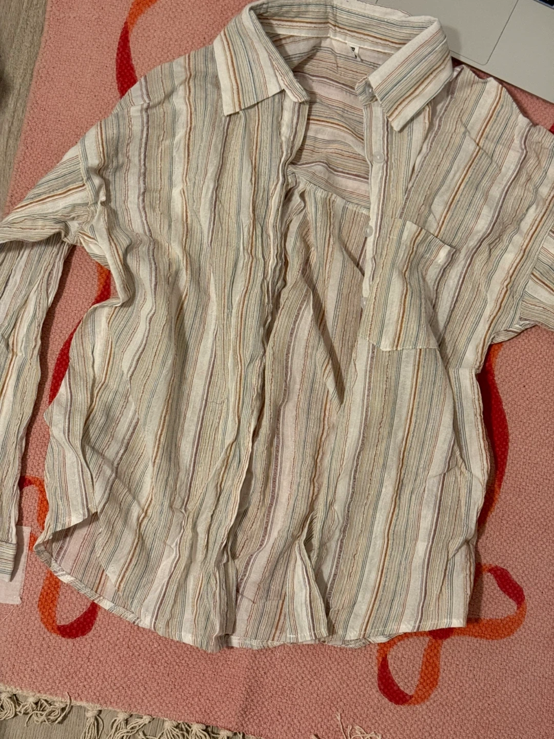 Women's button-up shirt with a vertical striped pattern. It features a collared neckline and a button-front closure. Made with lightweight fabric.