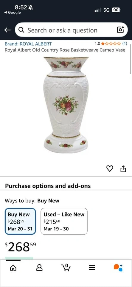 Buy & SellRoyal Albert Vase *Brand NewRoyal Albert Vase *Brand New$150Brand new in the box Royal Albert. Retails for $250+ on Amazon.WHERE TO MEETHomeView MapSELLERVictoria LambertWelland25520 reviews0 chats·0 favorites·1 viewsSEND CHAT TO SELLERHi Victoria Lambert! I’m interested in your listing.Hi Victoria Lambert! I’m interested in your listing.Get the Karrot app to chatSign In to chat