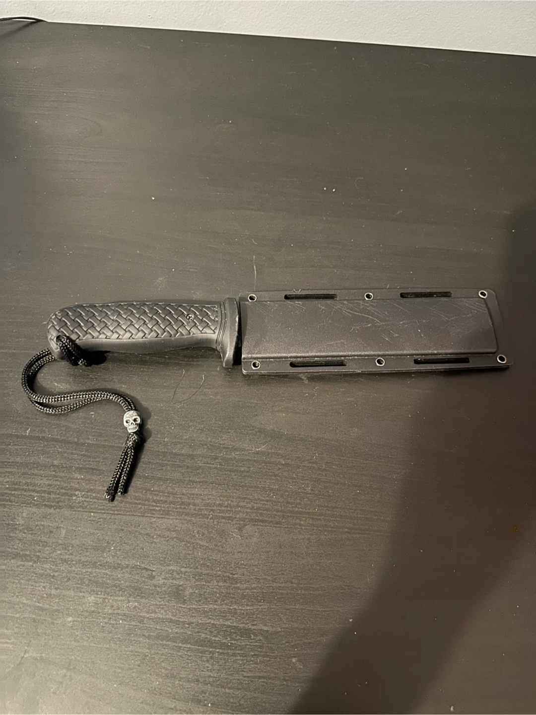 Black tactical knife with a textured grip. It comes with a black sheath and a lanyard with a skull charm. The blade has 'MOLON LABE' etched on it.