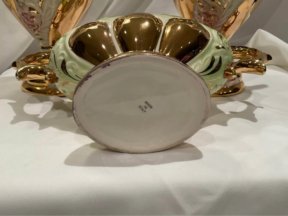 Vintage 3 pc Italian Rococo Baroque Mid 20th Century Gold Gilt Made In Italy. Vessel (1): 13" Width / 7 1/2" Height. Urns (2): 11" Height. Pristine condition. Smoke & pet free home. Cash only - Richmond Hill Bathurst & King Rd.