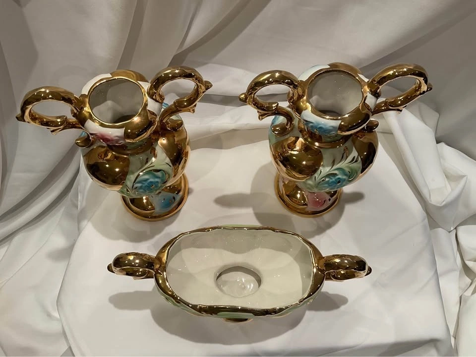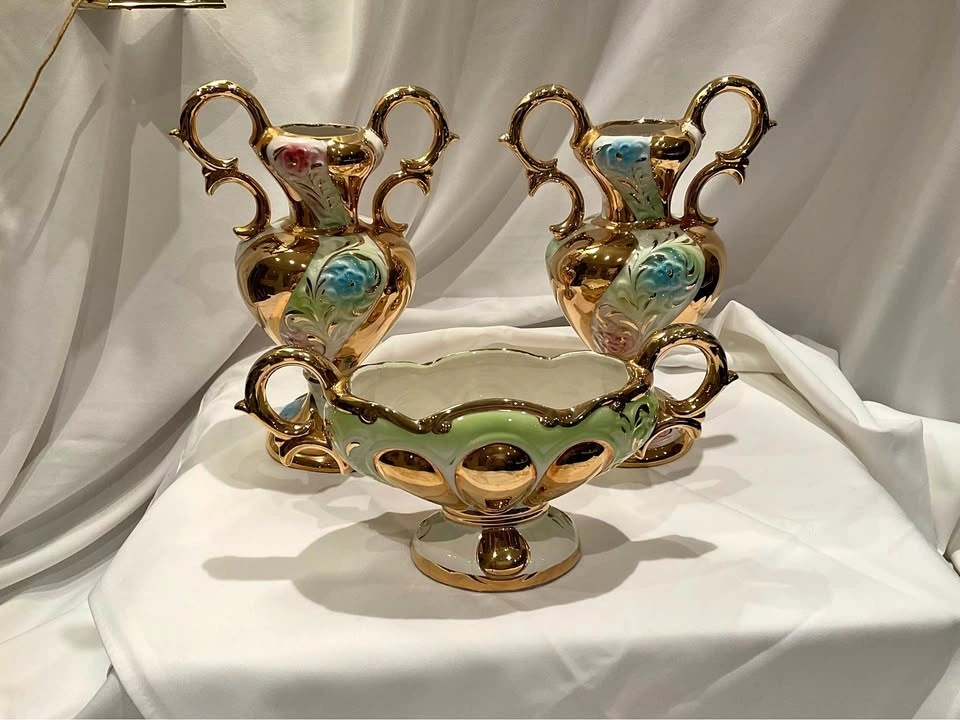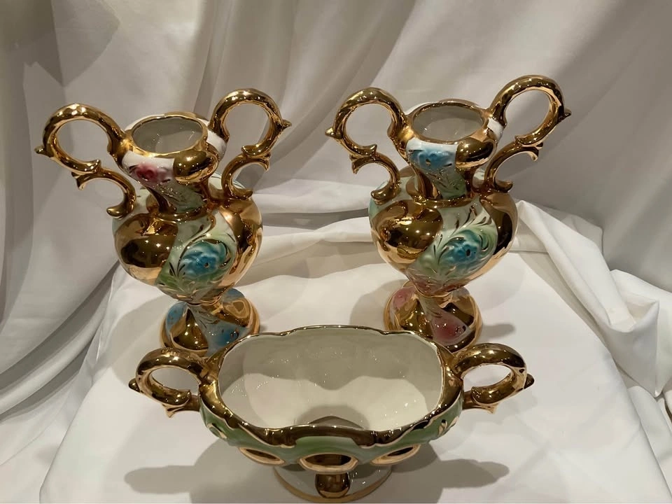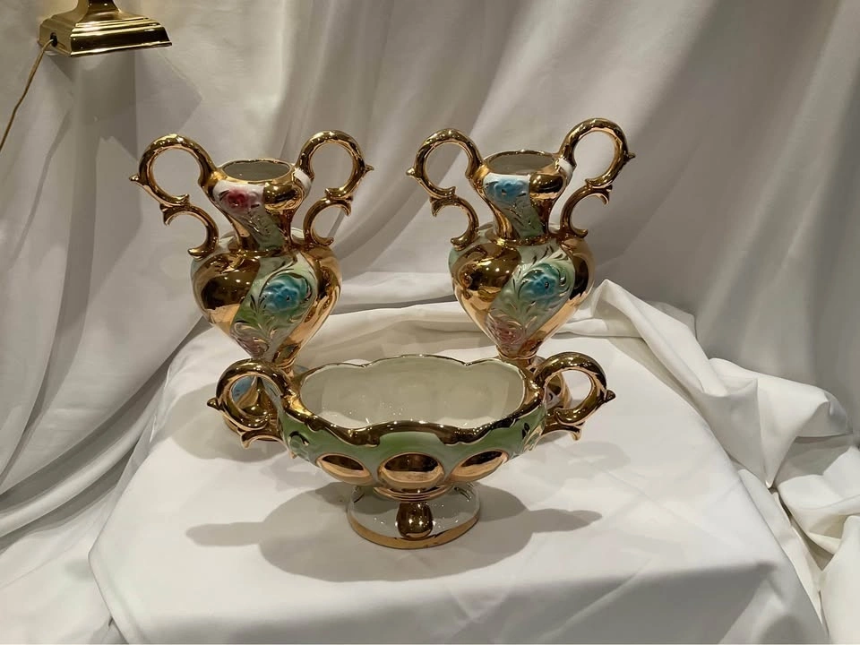 Vintage 3 pc Italian Rococo Baroque Mid 20th Century Gold Gilt Made In Italy. Vessel (1): 13" Width / 7 1/2" Height. Urns (2): 11" Height. Pristine condition. Smoke & pet free home. Cash only - Richmond Hill Bathurst & King Rd.