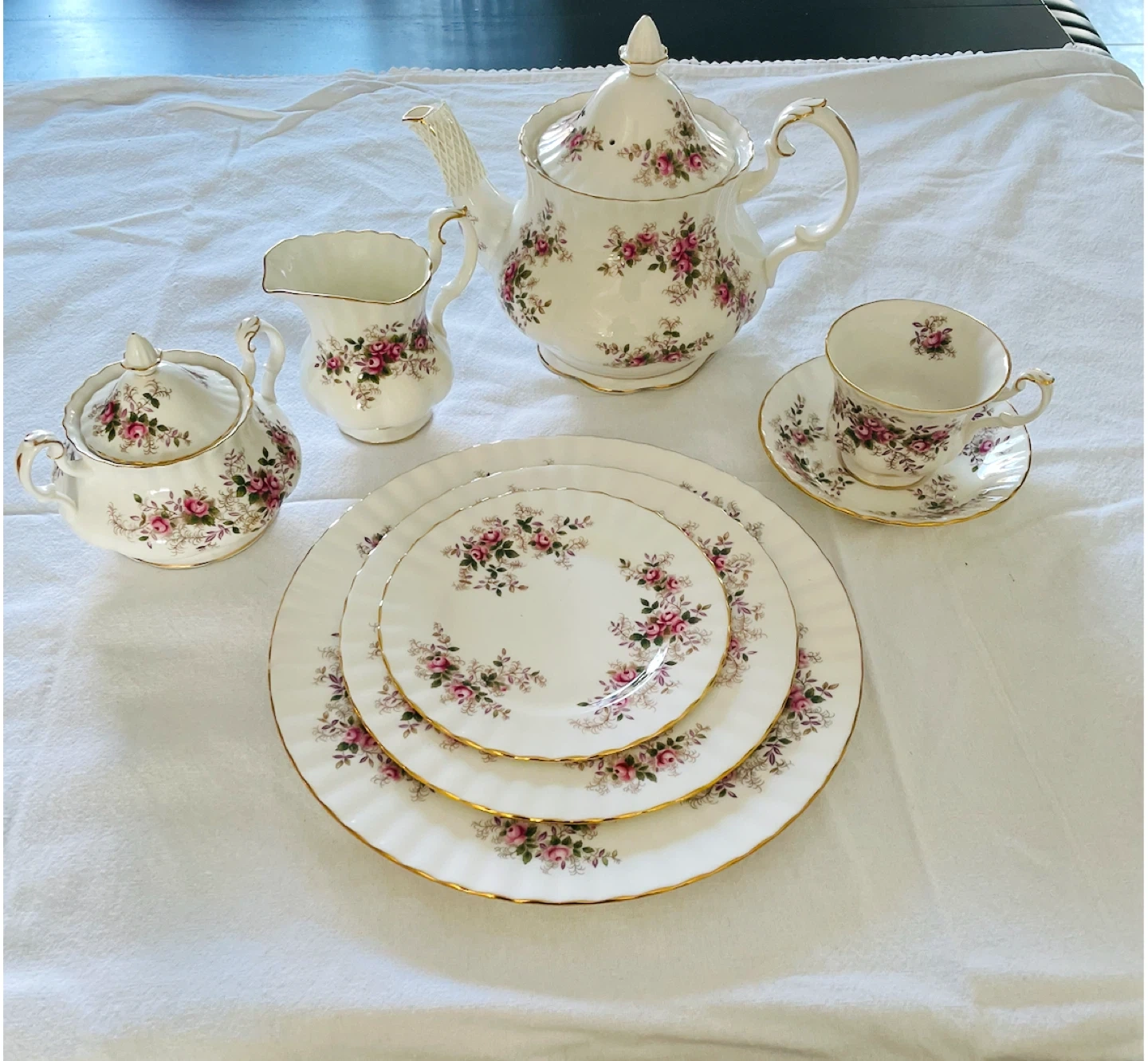 Beautiful Royal Albert bone china dinnerware set in the Lavender Rose pattern. This set includes a teapot, sugar bowl with lid, creamer, cup, and saucer, along with dinner plates, side plates and dessert plates. It's adorned with delicate pink roses and gold trim. Perfect for an elegant family dinner.