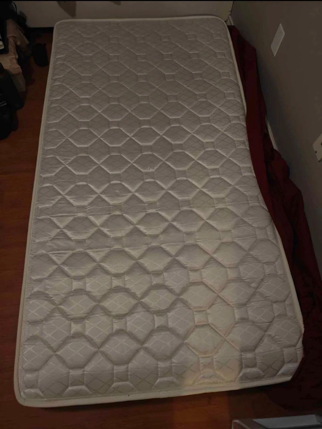 A standard twin-size mattress for your bed. It's covered in a quilted white fabric. This mattress is ready for a new home!