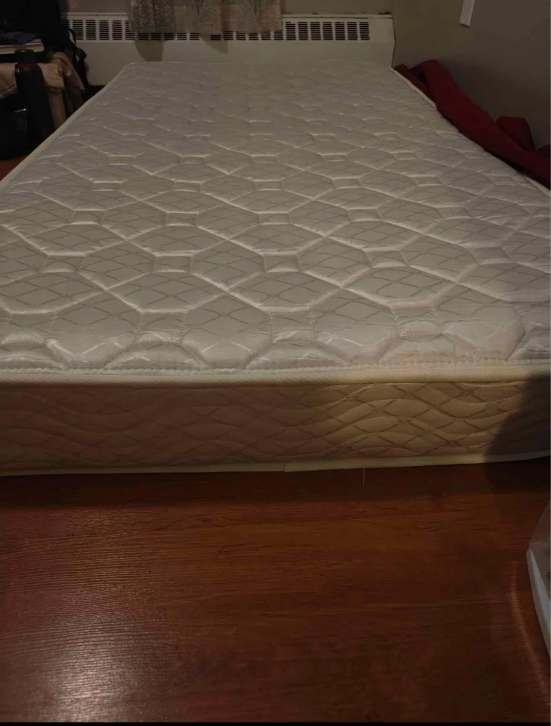 A standard twin-size mattress for your bed. It's covered in a quilted white fabric. This mattress is ready for a new home!