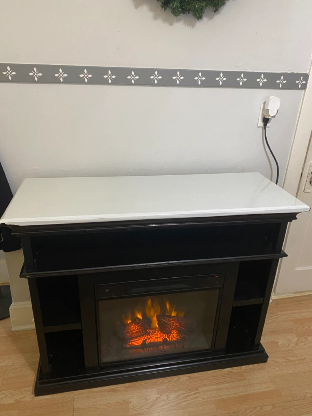 Here is a black fireplace TV stand with a white top! It's about 46 inches wide. It's in great condition and ready for a new home!