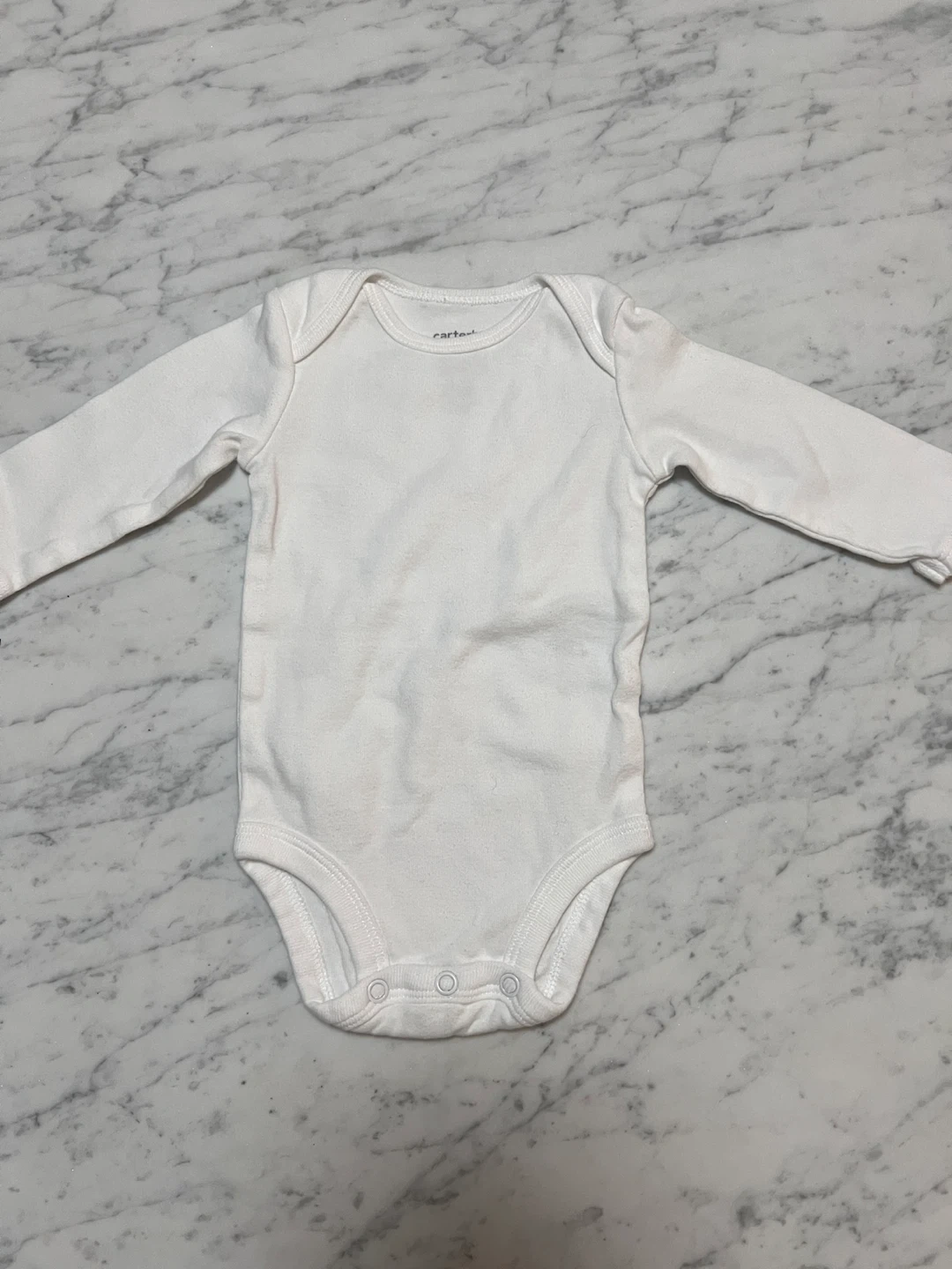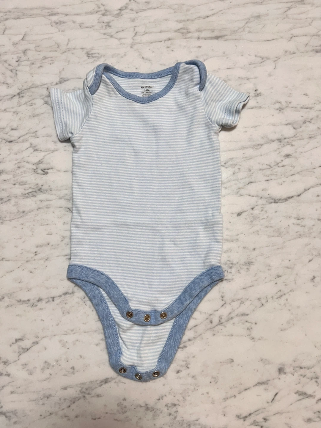Bundle includes 4 pieces of baby clothing: a blue long-sleeve sleeper with a teddy bear, a white long-sleeve onesie, a white short-sleeve onesie, and a blue and white striped short-sleeve onesie. Made of soft cotton material. 0-6months.
